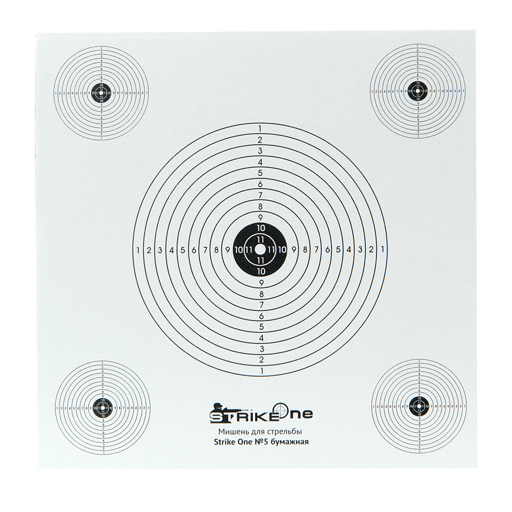 Мишень предназначена для охотничьих тренировок и развлекательной стрельбы в тирах. Основные параметры соответствуют стандартной мишени Strike One: материал изготовления — плотный картон размером 14×14 см. Фон белый, диаметр главной мишени 81 мм (на дополнительных 30 мм), диаметр «десятки» и расстояние между окружностями 3 мм (на дополнительных 1 мм). Применяется на дистанциях до 10 м. В комплекте 1 лист с мишенью.