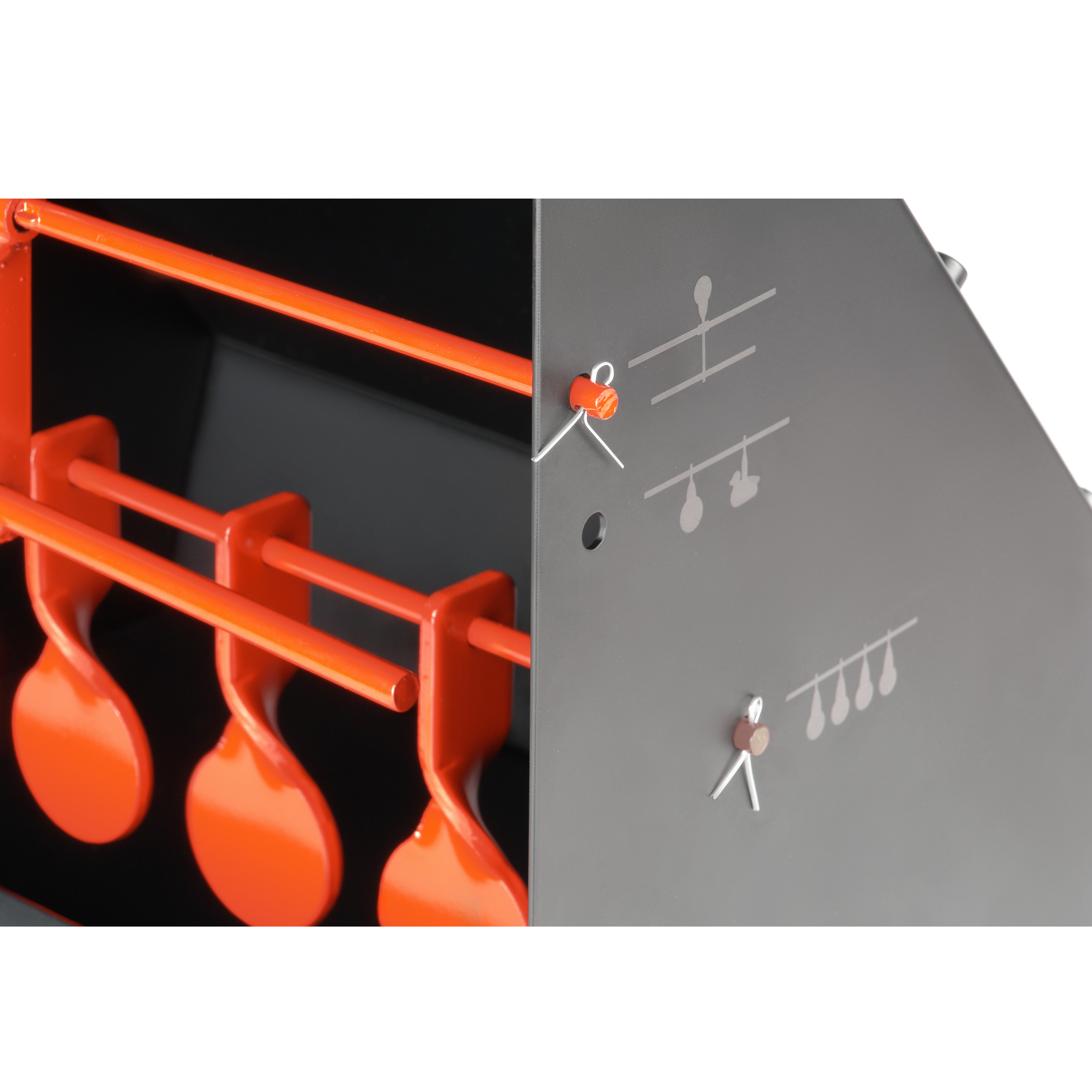 Миниатюрный тир оснащен ярко окрашенными металлическими мишенями на 5 целей, подвешенными на перекладине. При точном попадании мишени проворачиваются вокруг оси, создавая хорошо слышимый металлический щелчок. Такая реакция цели позволяет вести скоростную стрельбу без необходимости ручного возврата мишеней в исходное положение.