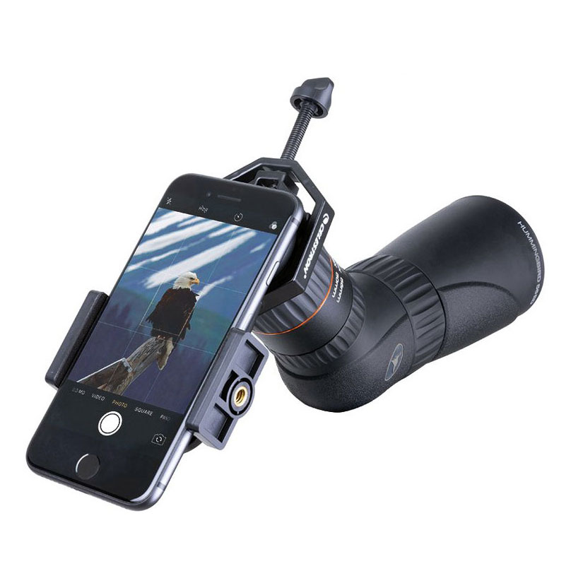 Телефон надежно и безопасно закрепляется на адаптере с помощью зажимных винтов. После этого нужно выровнять камеру по центру окуляра оптического прибора и зафиксировать на нем адаптер. Осталось только отрегулировать фокус, добиться четкости изображения – и можно приступать к работе! Вы сможете редактировать фото и отправлять их друзьям в соцсетях, не снимая телефон с окуляра.