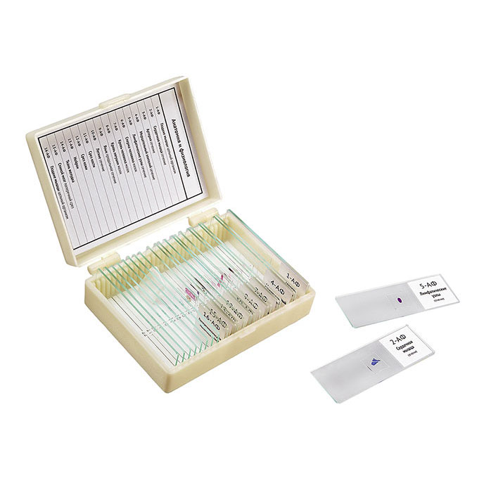 Учебный микропрепарат представляет собой предметное стекло с расположенным и закрепленным на нем объектом, уже подготовленным для исследования под микроскопом. Сверху объект накрыт тонким покровным стеклом. Размеры готовых препаратов стандартные (25 мм х 76 мм) и подходят для использования с любым биологическим микроскопом Микромед. Все микропрепараты подписаны, пронумерованы и помещены в пластиковые кейсы с индивидуальными ячейками для удобства хранения и изучения.