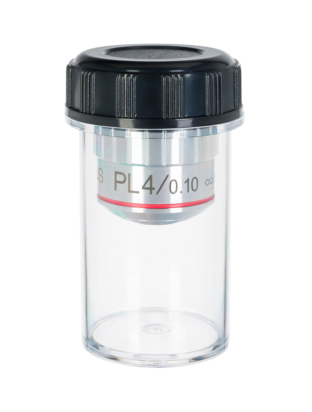 Объектив MP4 4х/0,10 обладает увеличением 4х и пределом разрешения 2,75 мкм. Полезное увеличение микроскопа при его комплектовании этой моделью будет находиться в интервале от 50 до 100 крат, такое увеличение сможет дать оптическая система с окуляром кратностью от 12,5 до 25х. Использовать окуляры меньшей кратности не рекомендуется, так как они не позволят рассмотреть объект детально. Окуляры с увеличением больше 25х нецелесообразны в этой системе, так как не привнесут новой информации.