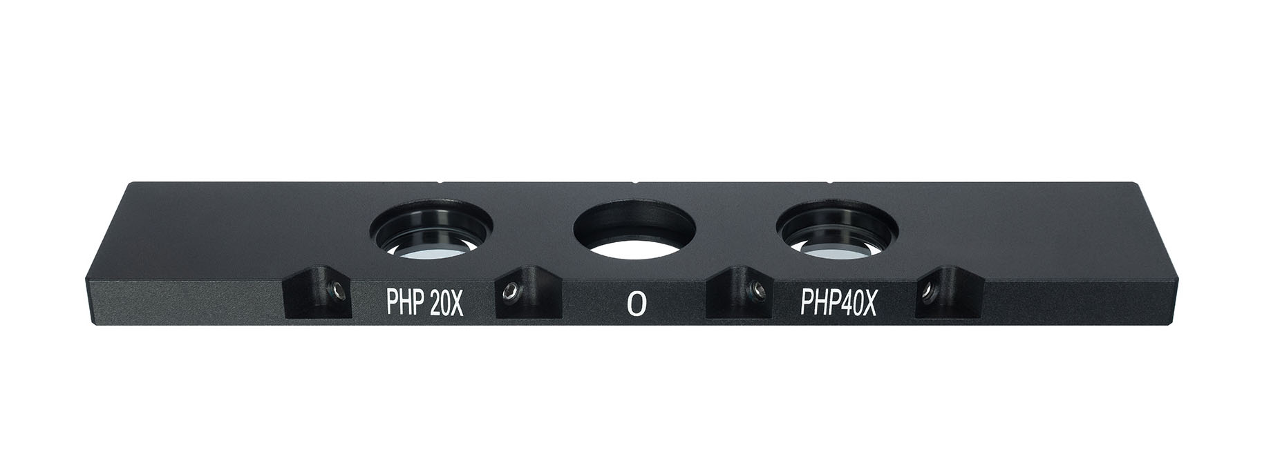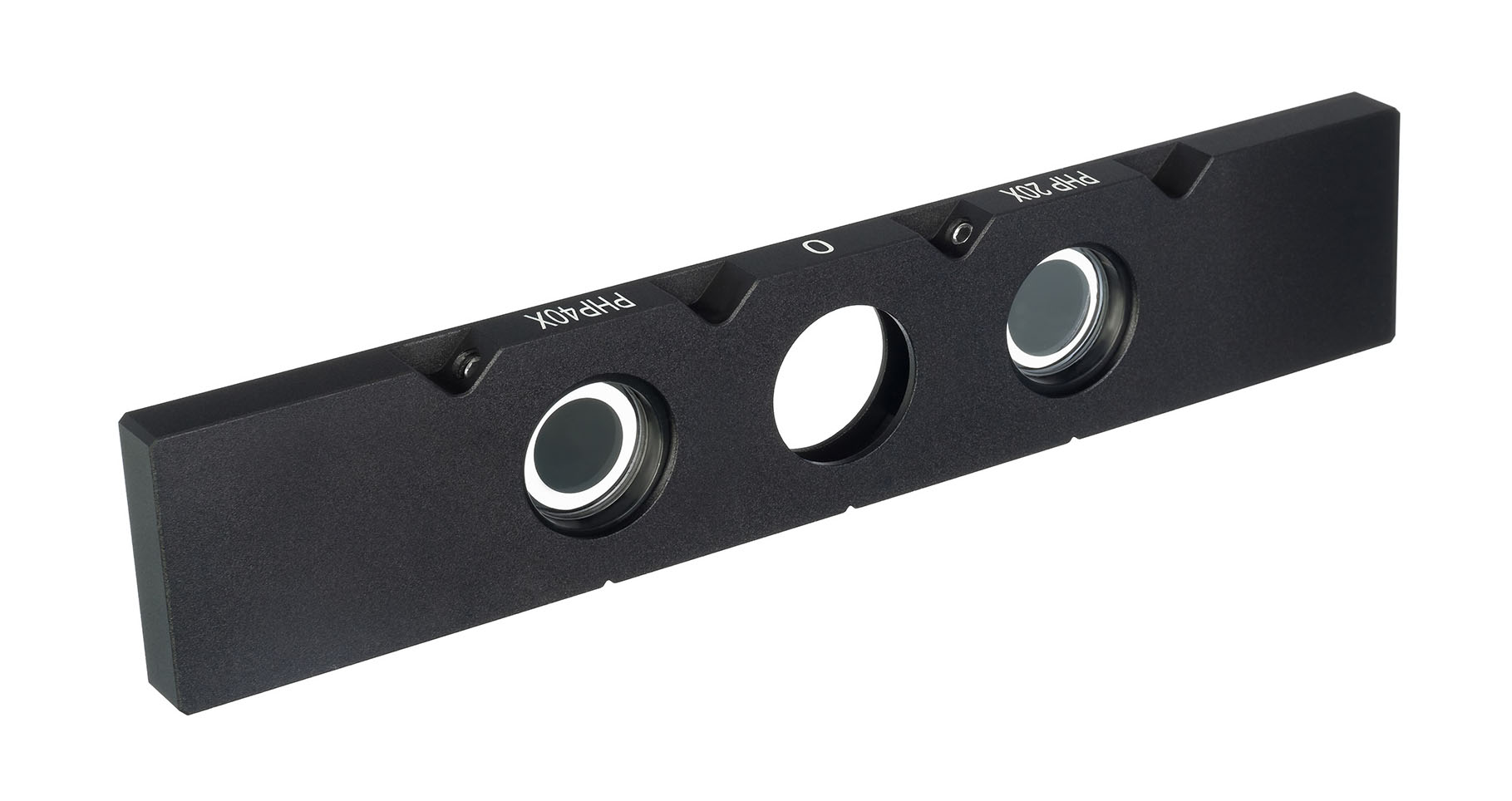 В слайдере три отверстия. Боковые отверстия имеют встроенные вставки: одно используется для работы на объективе с увеличением 20х, второе – на объективе с увеличением 40х. Центральное отверстие не имеет вставки и применяется для работы в светлом поле. Место установки слайдера – слот конденсора микроскопа. После установки необходимо отцентрировать диафрагмы слайдера в соответствии с фазовыми кольцами объективов. Для этого используется вспомогательный центрирующий телескоп, входящий в комплект микроскопа MAGUS Bio V300.