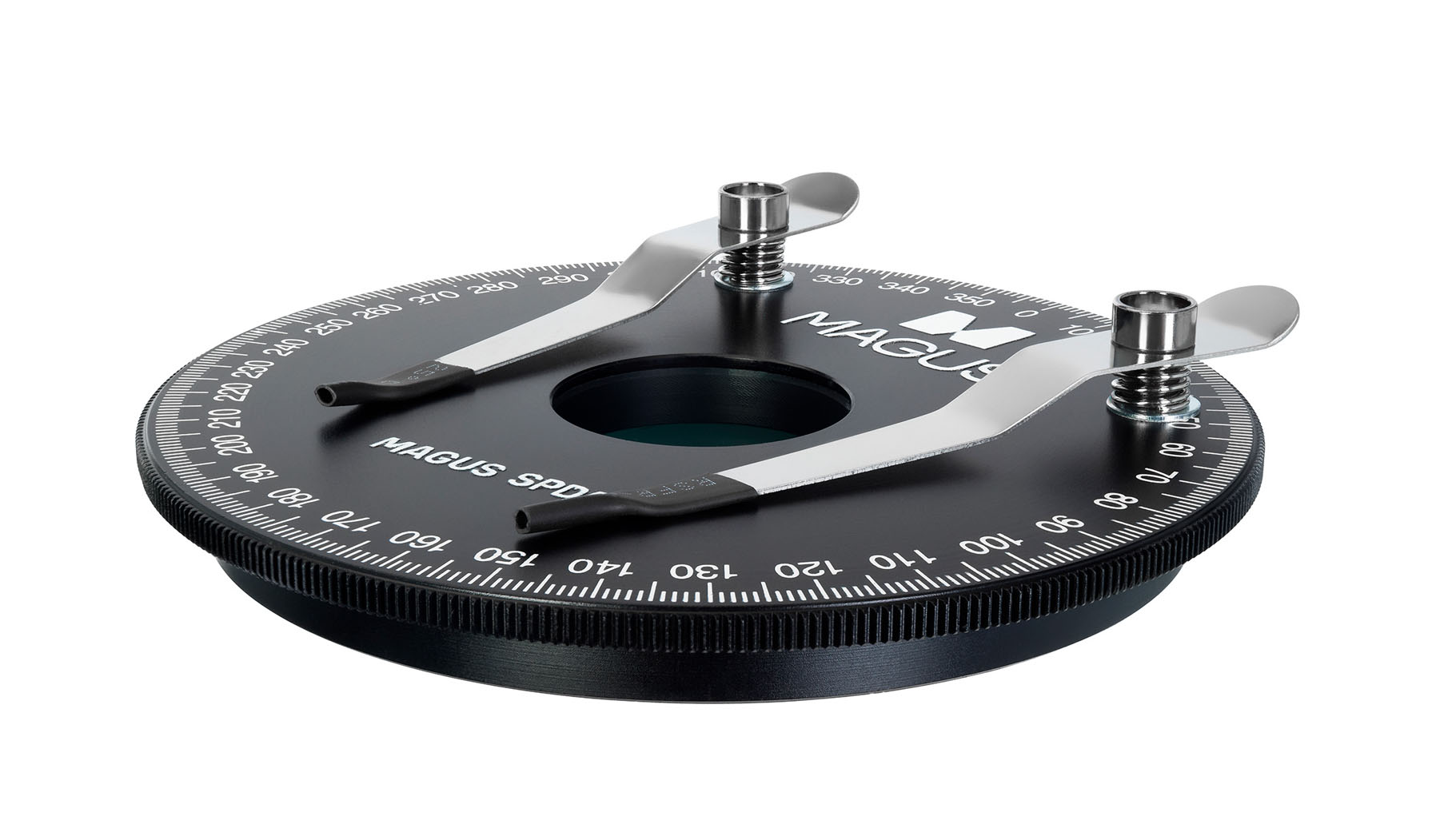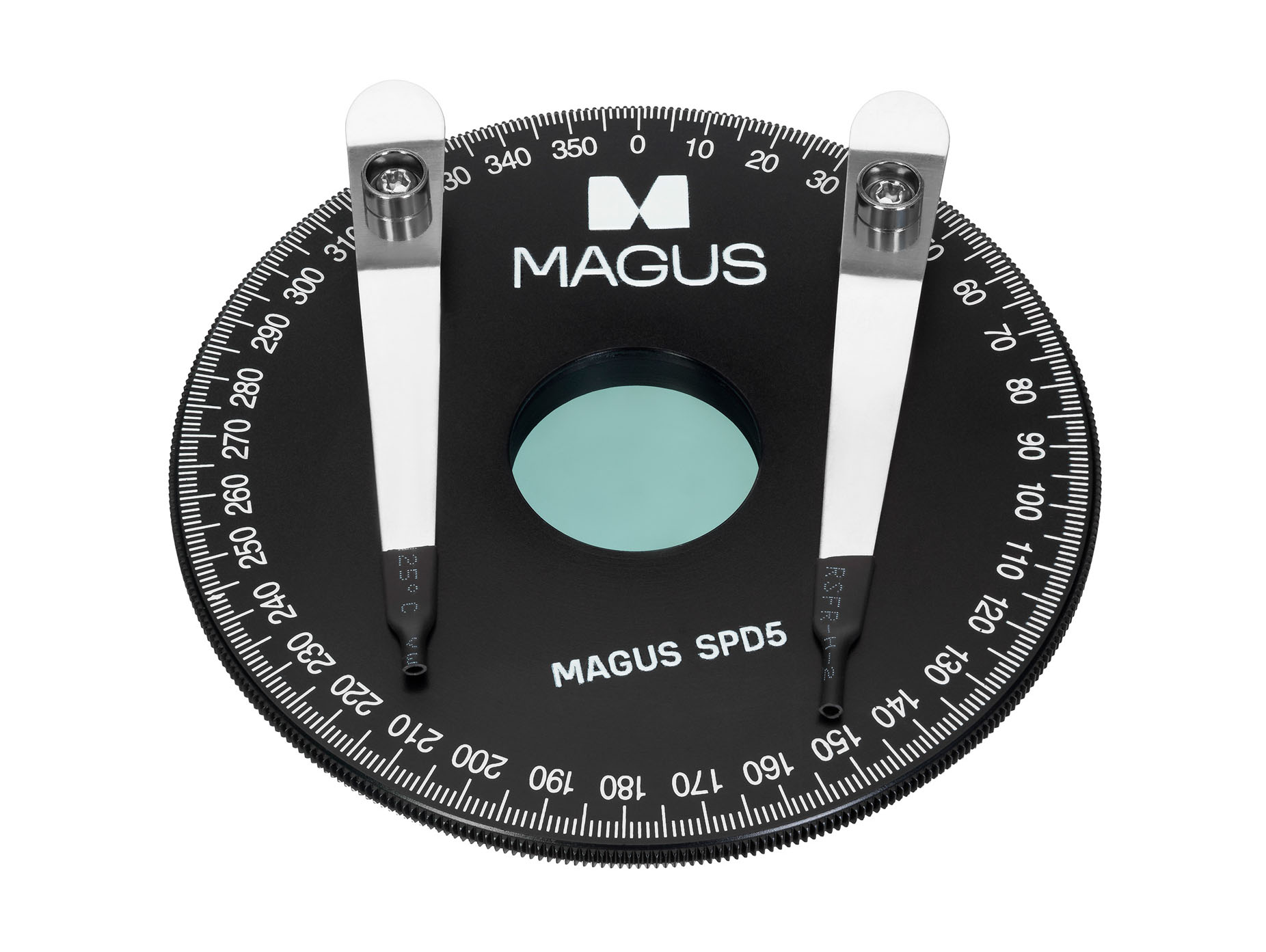 Устройство MAGUS SPD5, который представляет собой пару «поляризатор–анализатор», предназначено для исследований в поляризованном свете и позволяет плавно регулировать интенсивность проходящих лучей вплоть до полного затемнения. Поляризатор снабжен двумя зажимами.