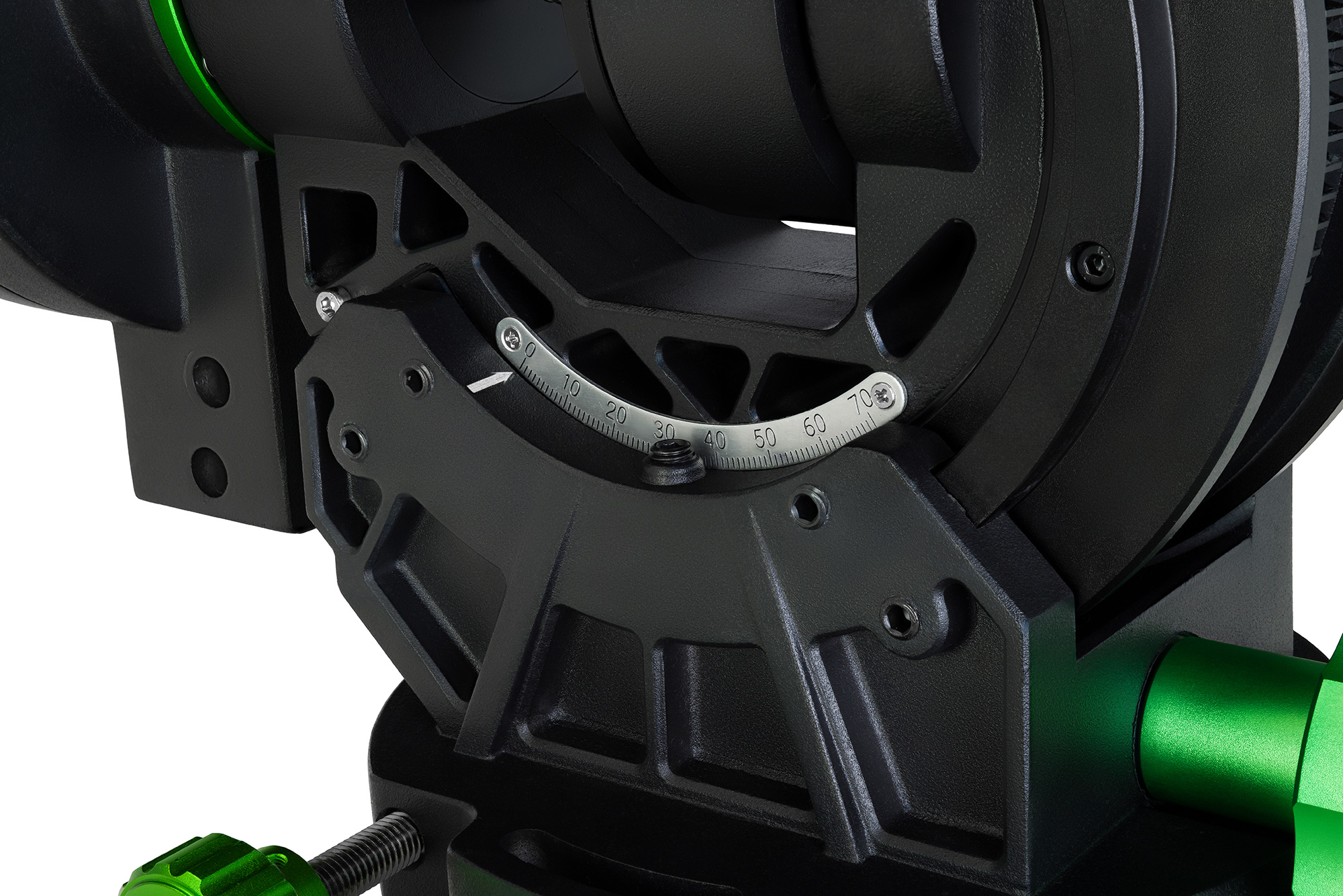 Движение монтировки и точность ее наведения обеспечиваются сложным механизмом, состоящим из червячных и ременных передач, а также зубчатых колес. Рабочие оси приводятся в движение гибридными шаговыми двигателями с контроллерами высокого разрешения. Один шаг шагового двигателя составляет 0,9°. Максимальная скорость поворота монтировки – 4° в секунду.