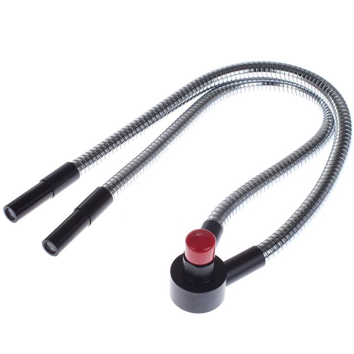 Волоконный осветитель двойной представляет собой два многожильных стеклянных волновода, размещенных в гибких металлическоих рукавах.