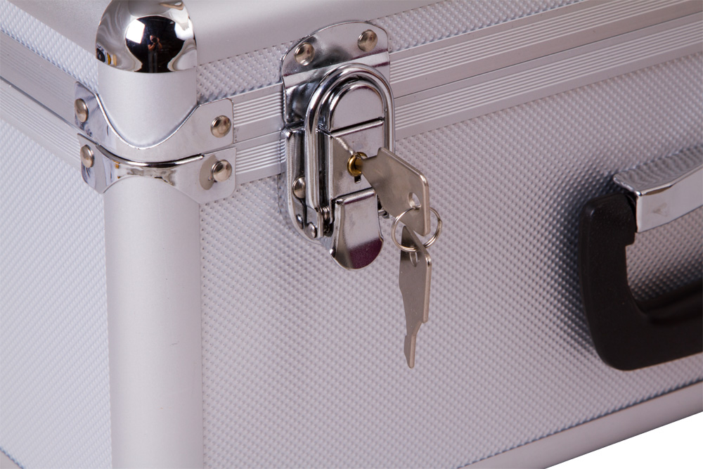 Внешние поверхности кейса сделаны из алюминия. Ребра и углы усилены металлическими пластинами. Есть ручка для переноски и два замка. Их можно закрыть на ключ, который входит в комплект поставки.
