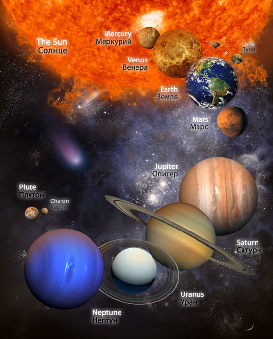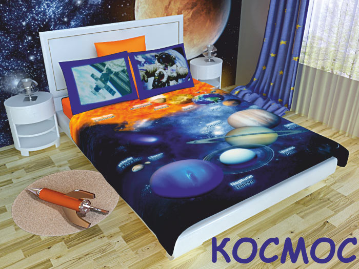 Кроме того, комплект постельного белья «Космос» является замечательным и необычным учебным пособием в области астрономии с названиями планет и спутников на русском и английском языках.