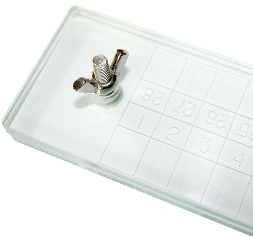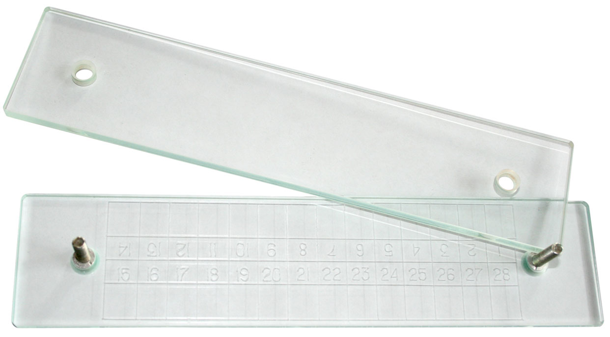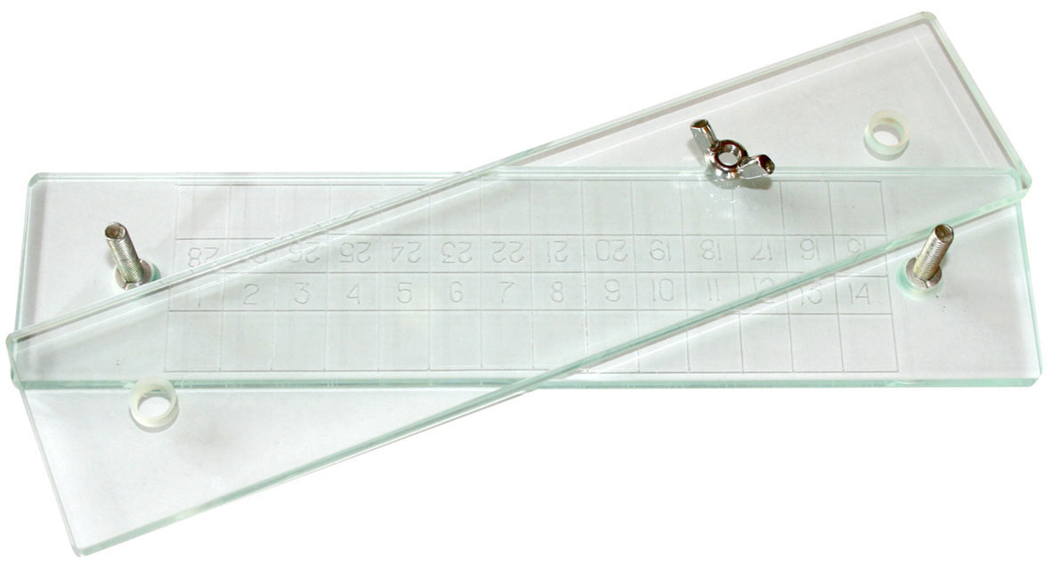 Приспособление представляет собой два толстых стекла с прижимными винтами, которые фиксируются с помощью барашковых гаек. Пробы мышечной ткани размещаются в пронумерованных прямоугольных ячейках на нижнем стекле и плотно прижимаются верхним стеклом. В результате этого образцы уплощаются, и их можно эффективно исследовать на предмет наличия паразитов с помощью оптической техники. Всего между стеклами можно разместить до 28 проб, что позволяет провести исчерпывающий и точный анализ.