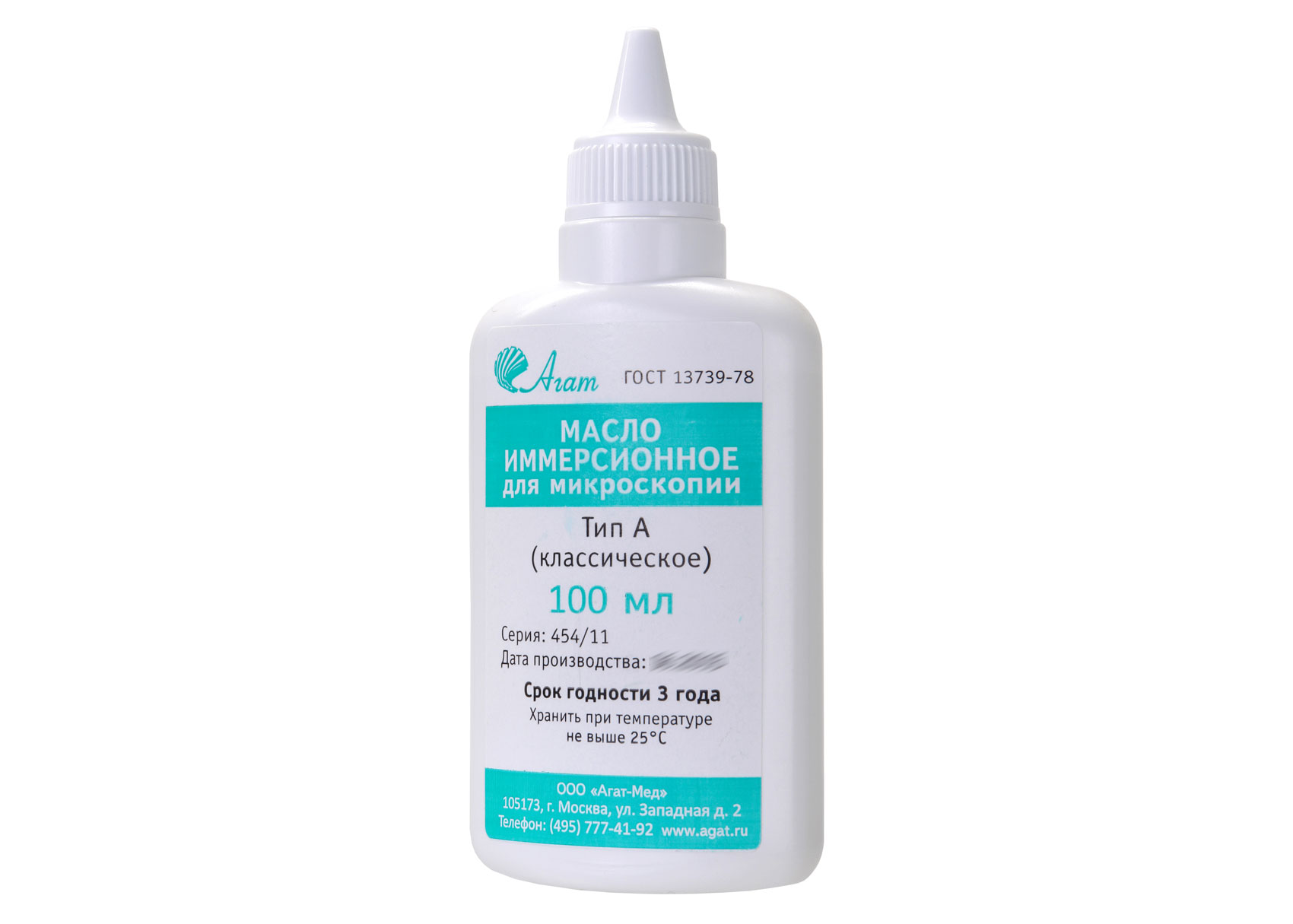 Иммерсионное масло «Агат», тип А – синтетическое масло для иммерсионных микроскопических наблюдений. Этот метод широко применяется для наблюдений на высокой кратности увеличения в медицинских исследованиях, в кристаллооптических исследованиях горных пород и минералов, а также других твердых тел. Масляная иммерсия используется для определения показателей светопреломления твердых фаз в смесях веществ и уровня чистоты соединений. Исследуемый объект помещается в каплю иммерсионного масла, нанесенную на предметное стекло. Также масло может наноситься на покровное стекло препарата.