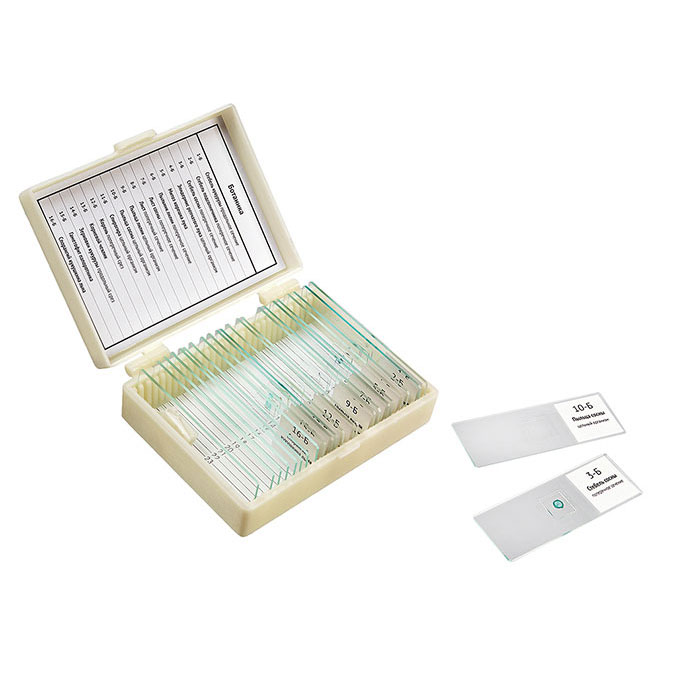 16 образцов, предметные стекла, покровные стекла.