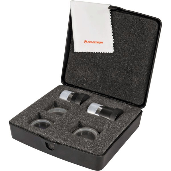 Дополнительные окуляры используются в тех случаях, когда необходимо расширить возможности увеличения телескопа. В комплект набора входят два окуляра: 15 и 9 мм. Широкоугольный 15-миллиметровый окуляр предназначен для получения средних увеличений, а 9-миллиметровый – для получения больших увеличений. Большие увеличения помогут рассмотреть множество деталей на планетных дисках и поверхности Луны.