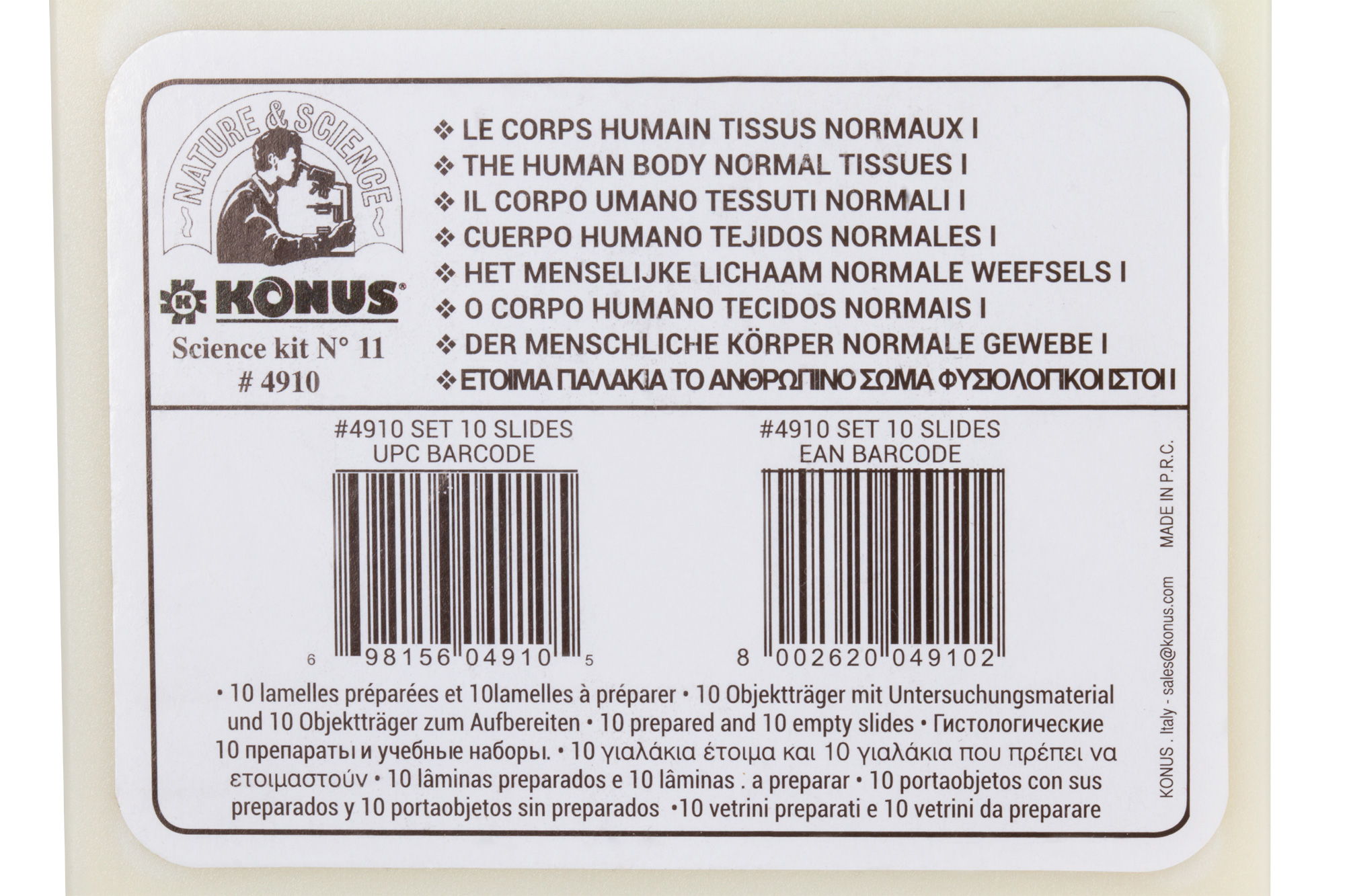 Тема этого набора микропрепаратов Konus – человеческое тело. С его помощью можно подробно изучить строение тканей разных органов. Возьмите микроскоп любой марки, поместите образец на предметный столик, наведите оптику и изучайте тайны микромира!