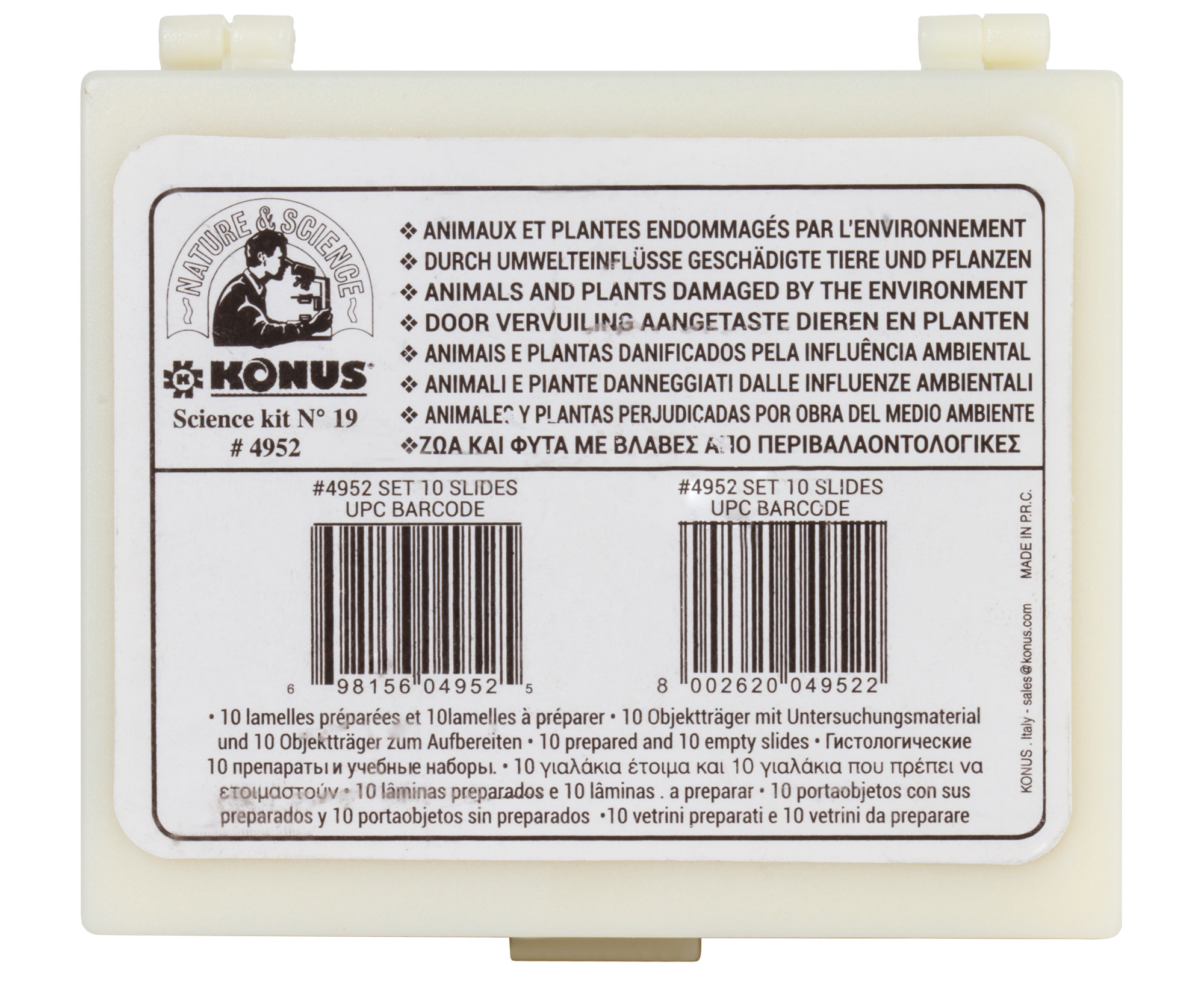 Этот набор микропрепаратов Konus интересен тем, что включает поистине уникальные образцы, а именно – поврежденные, мутировавшие или пораженные болезнью ткани животных и растений. Препараты обработаны специальным образом и уже готовы к исследованиям. Их можно рассматривать с помощью микроскопов любых марок.