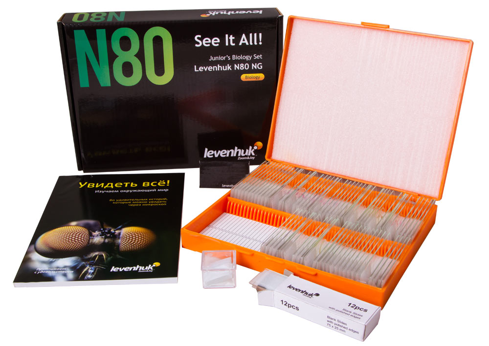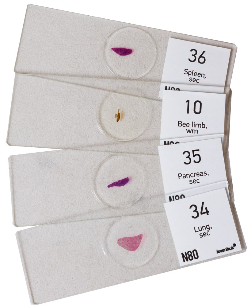 В комплект входят 80 готовых микропрепаратов с образцами тканей растений, животных и человека, а также часто встречающихся веществ. Также в набор входят чистые предметные и покровные стекла, которые можно использовать для изготовления собственных микропрепаратов.