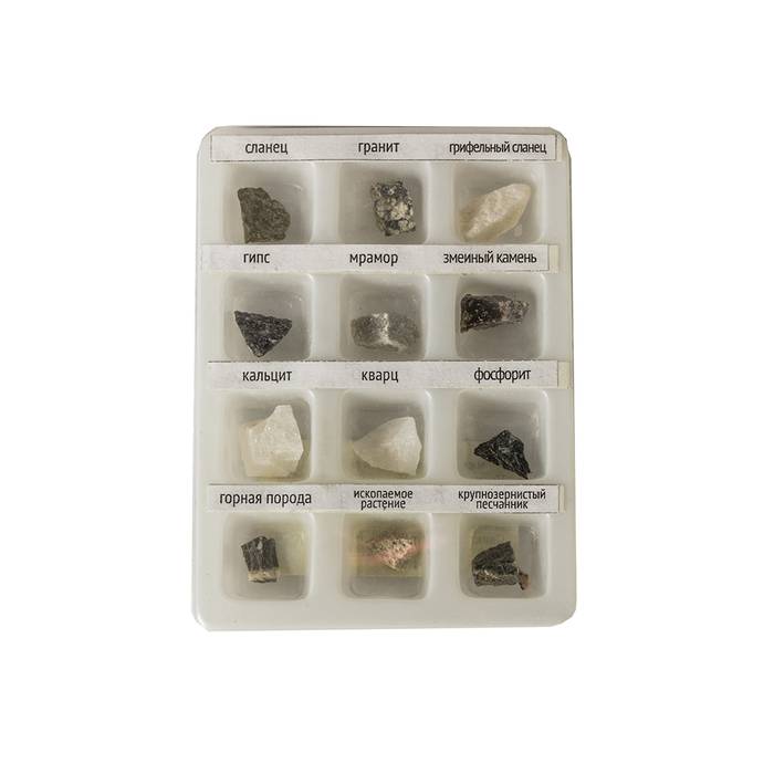 Набор образцов минеральных камней (12 шт.) для изучения под стерео-микроскопом.