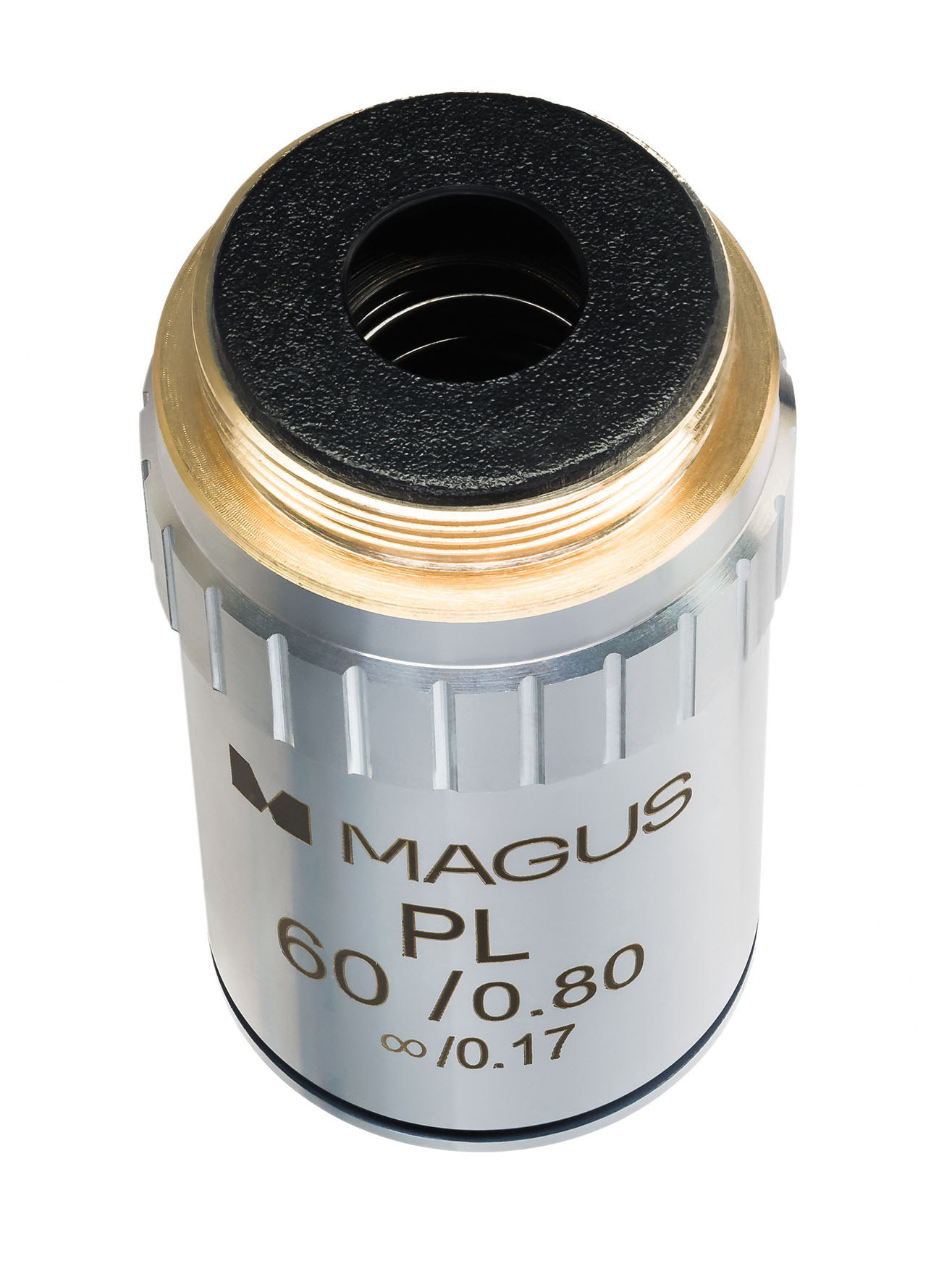 Для работы с объективом MAGUS MP60 60х/0,80 Plan ∞/0,17 подходят окуляры, увеличение которых находится в диапазоне от 7х до 14x. Следует использовать покровное стекло толщиной 0,17 мм. Парфокальный объектив имеет минимальную дисторсию, подходит для цифровой фотосъемки и может использоваться с широкопольными окулярами с полем зрения 22 мм.