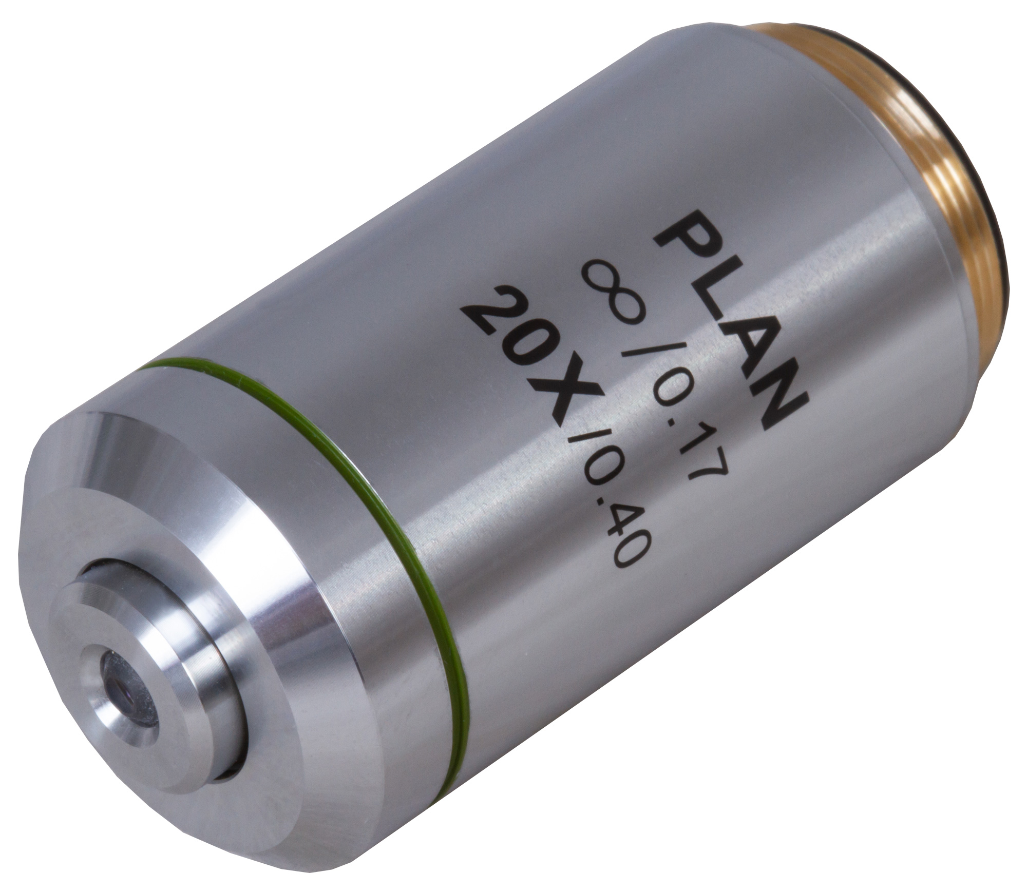 Объектив Levenhuk MED 20x/беск с «бесконечной» планахроматической оптикой дает 20-кратное увеличение и передает четкую, высококонтрастную картинку без аберраций. Поле зрения практически идеально плоское, что хорошо при проведении сложных лабораторных исследований. Линзы объектива сделаны из стекла и защищены металлическим корпусом.