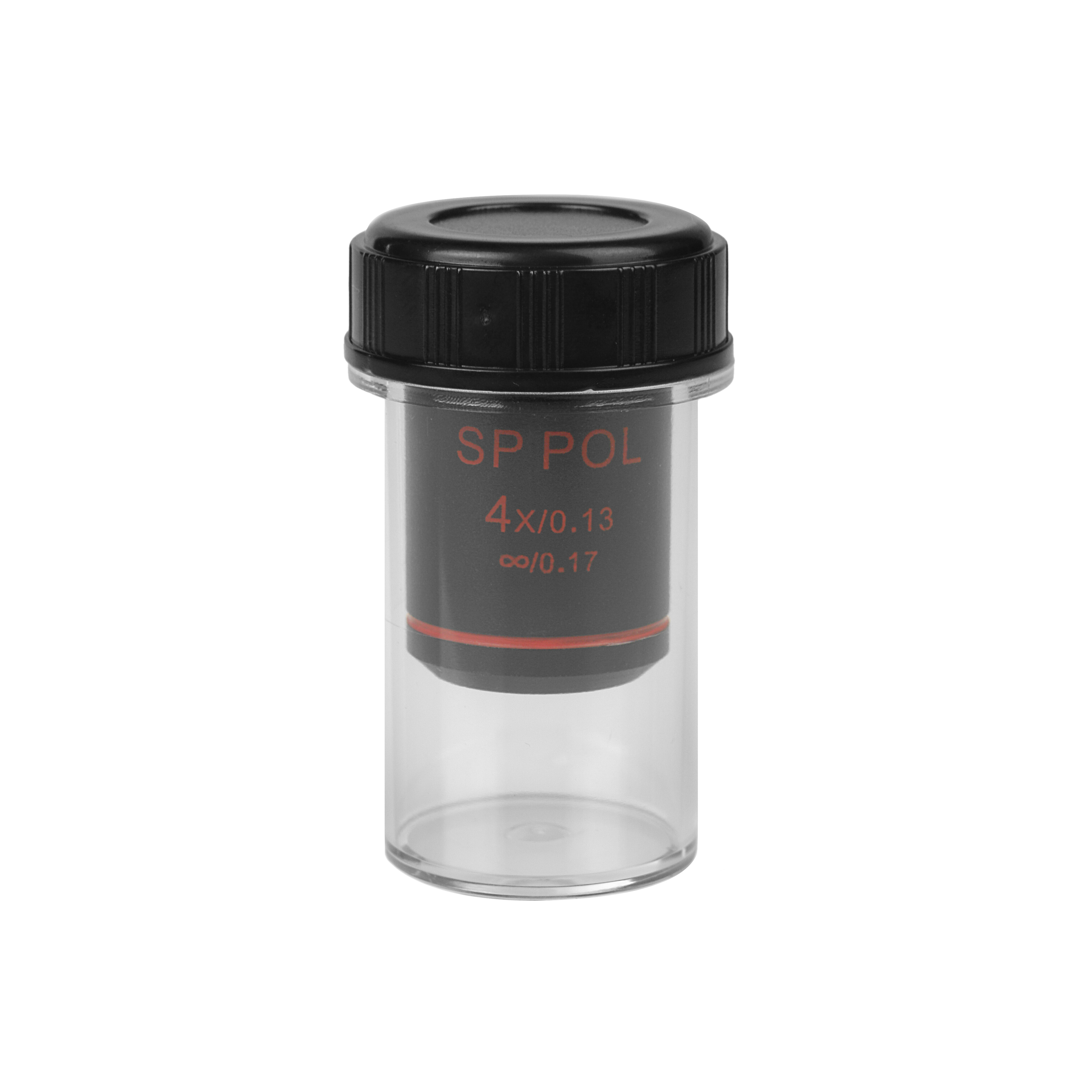 Объектив SP POL 4х/0.13 беск/0.17 (DIN) имеет посадочный диаметр 20,1 мм и предназначен для поляризационных микроскопов, поддерживающих установочный стандарт DIN. Рассчитан на длину тубуса «бесконечность». Подходит для исследования образцов с покровным стеклом толщиной 0,17 мм.