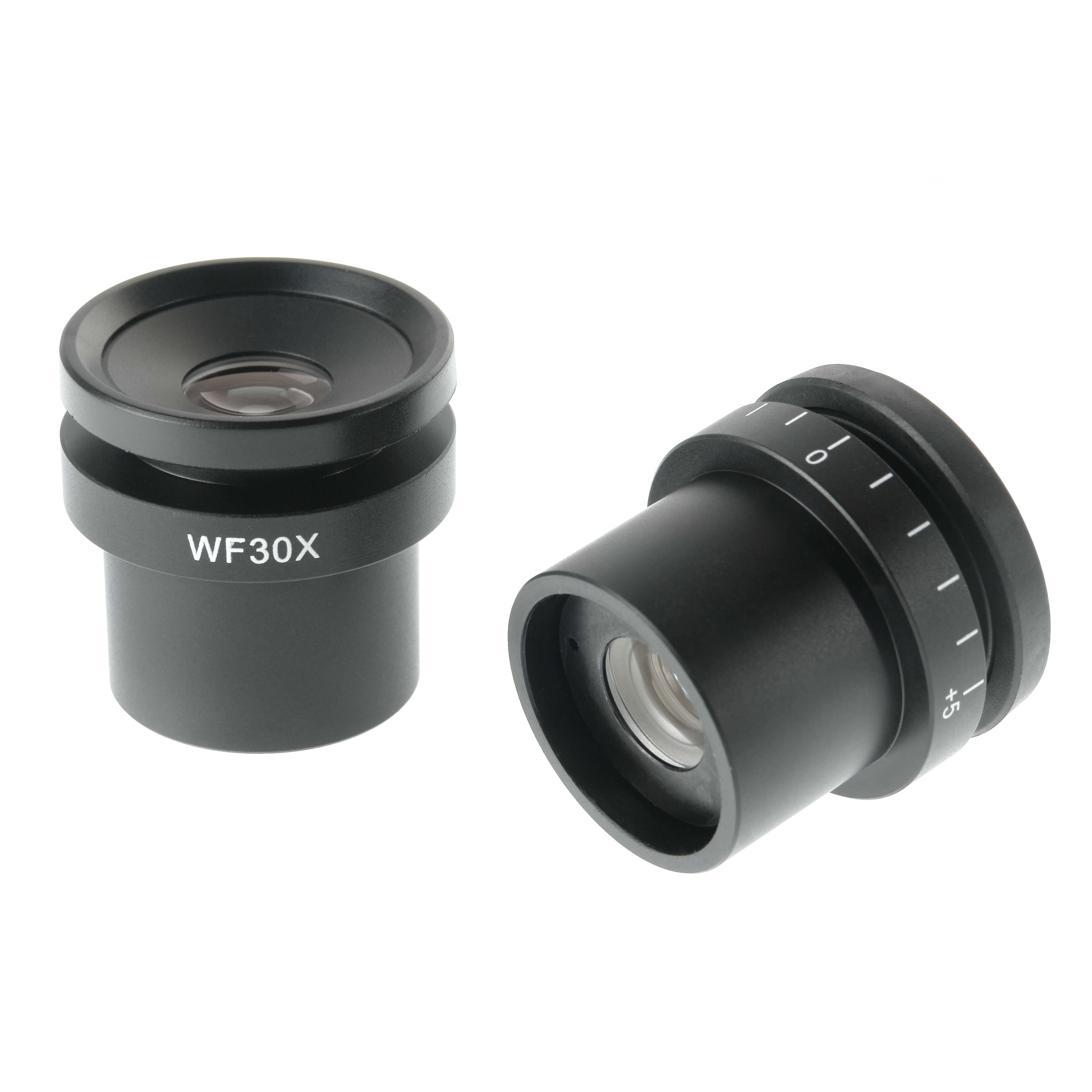 Окуляр WF30X устанавливается в окулярный тубус вместо штатного окуляра. При установке окуляров изменяется общее увеличение микроскопа и поле зрения. Рабочее расстояние при смене окуляров не изменяется. Диоптрийная коррекция ±5 диоптрий со шкалой на оправе окуляра.