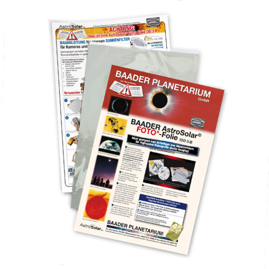 Пленка Baader AstroSolar Foto для астрофотографии – незаменимый помощник для тех, кто желает не только наблюдать Солнце, но и делать его фотоснимки высокого качества. С фильтром из этой пленки вы сможете рассматривать зернистость солнечной фотосферы, изучать структуру пятен, наблюдать факельные поля. Пленка подойдет для использования с телескопом и его искателем, а также с астрономическим биноклем. Аксессуар дает возможность вести фотосъемку Солнца на более коротких выдержках, чем при использовании обычной визуальной пленки.