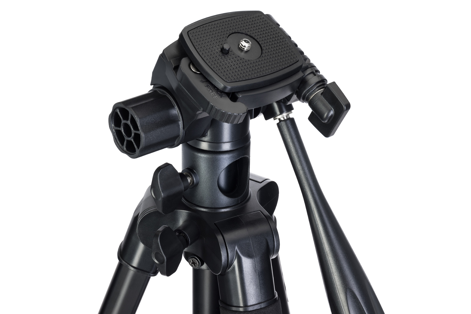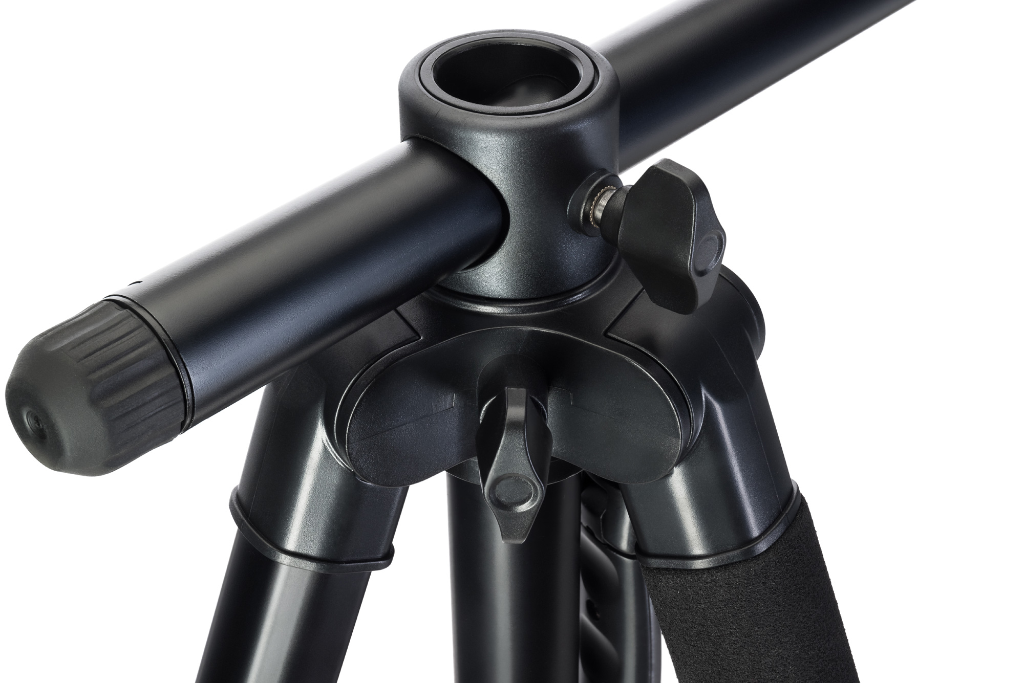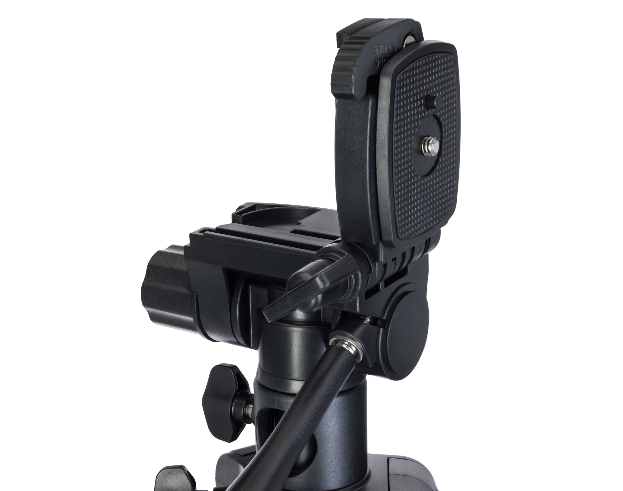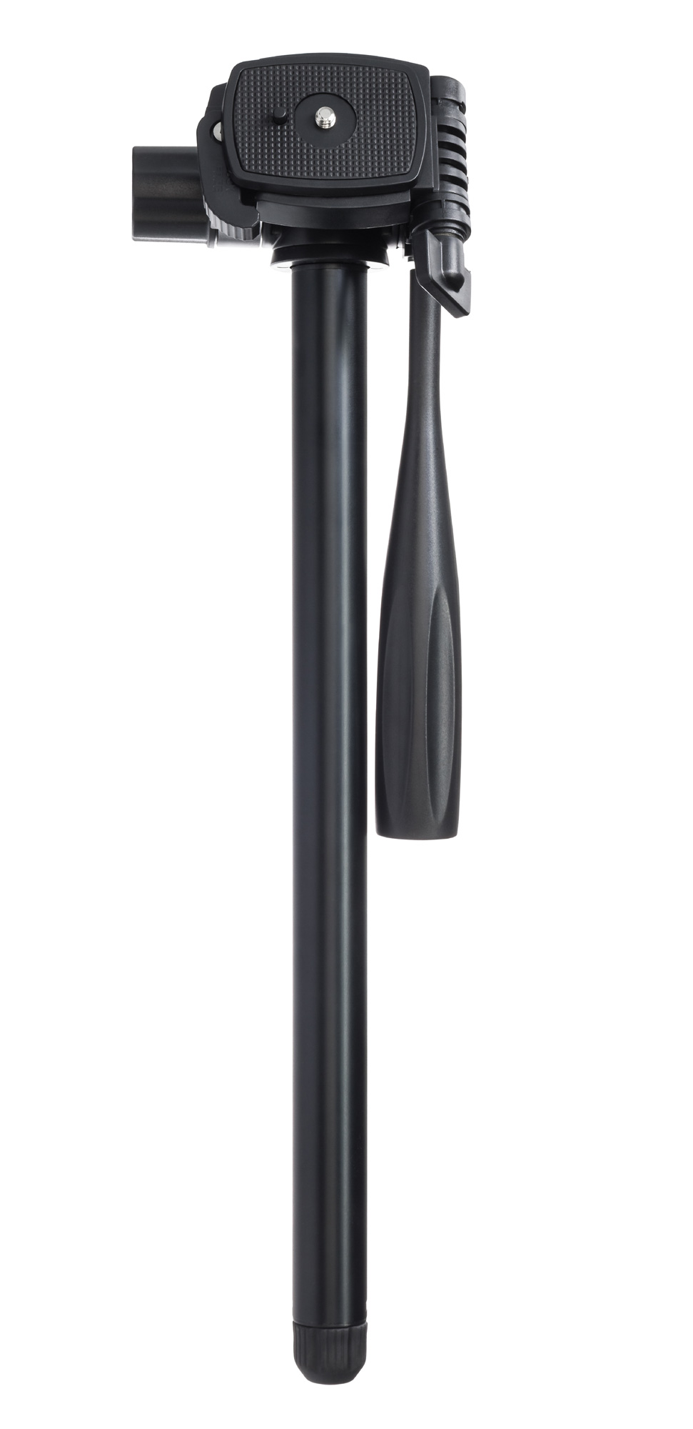 Штатив оснащен быстросъемной площадкой, которая позволяет значительно сэкономить время на установке и смене оборудования. Вращающаяся и наклоняемая пластиковая головка и фиксатор, отклоняющийся вбок до 90°, помогут достичь идеального ракурса съемки, наблюдения или угла освещения. Центральную секцию штатива можно использовать как самостоятельный монопод или установить ее на штатив горизонтально для съемки сверху вниз.
