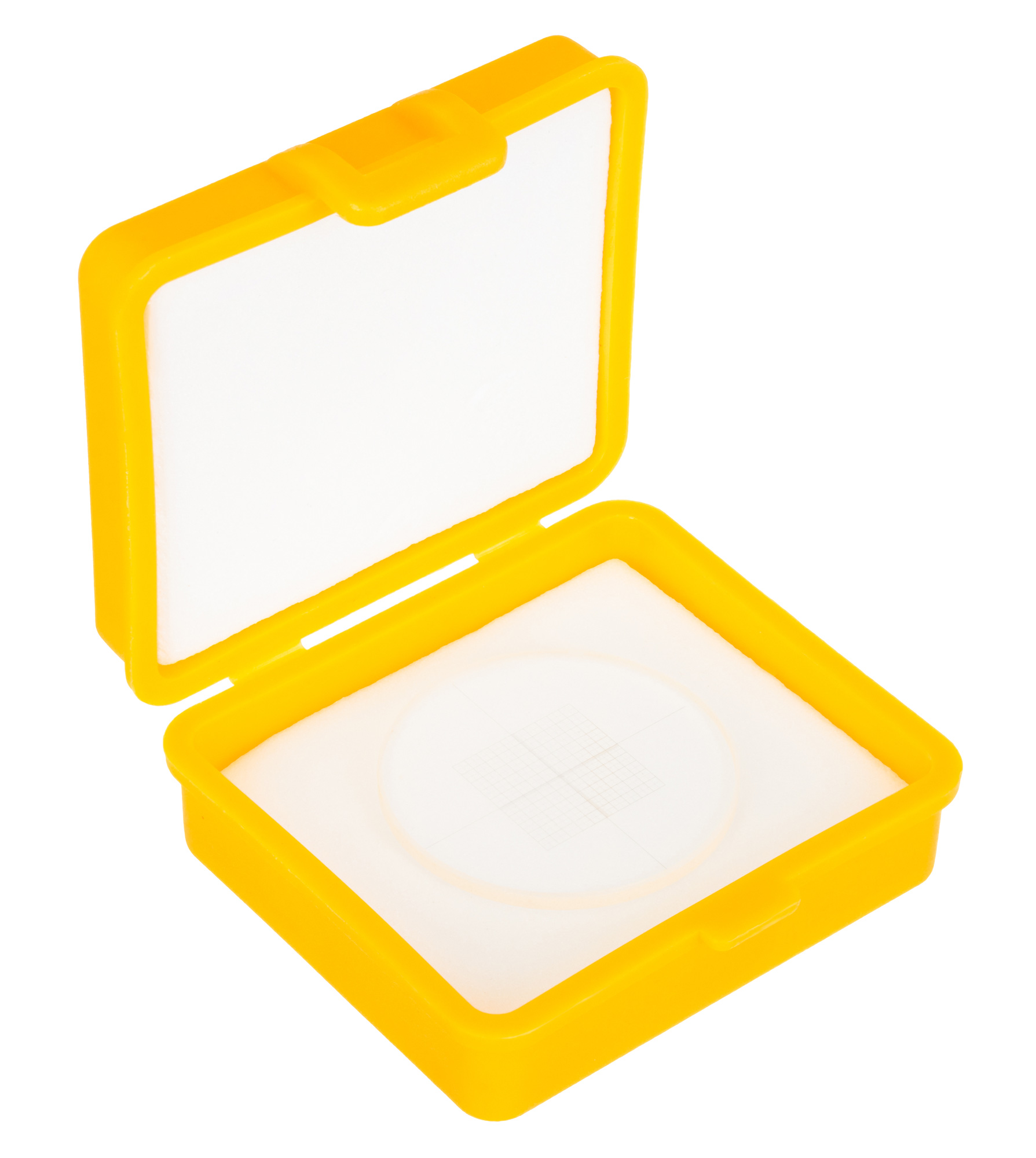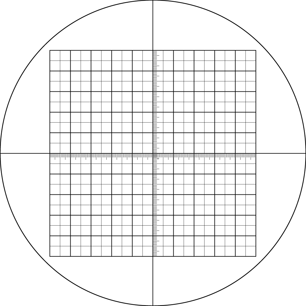 Калибровочный слайд MAGUS CSS2 для стереомикроскопов представляет собой пластину из оптического стекла диаметром 24 мм. На слайд нанесены перекрестие с микрометрическими шкалами по осям X и Y с ценой деления 0,05 мм и измерительная сетка 10х10 мм. В одном ряду сетки расположено 20 ячеек размером 0,5х0,5 мм.