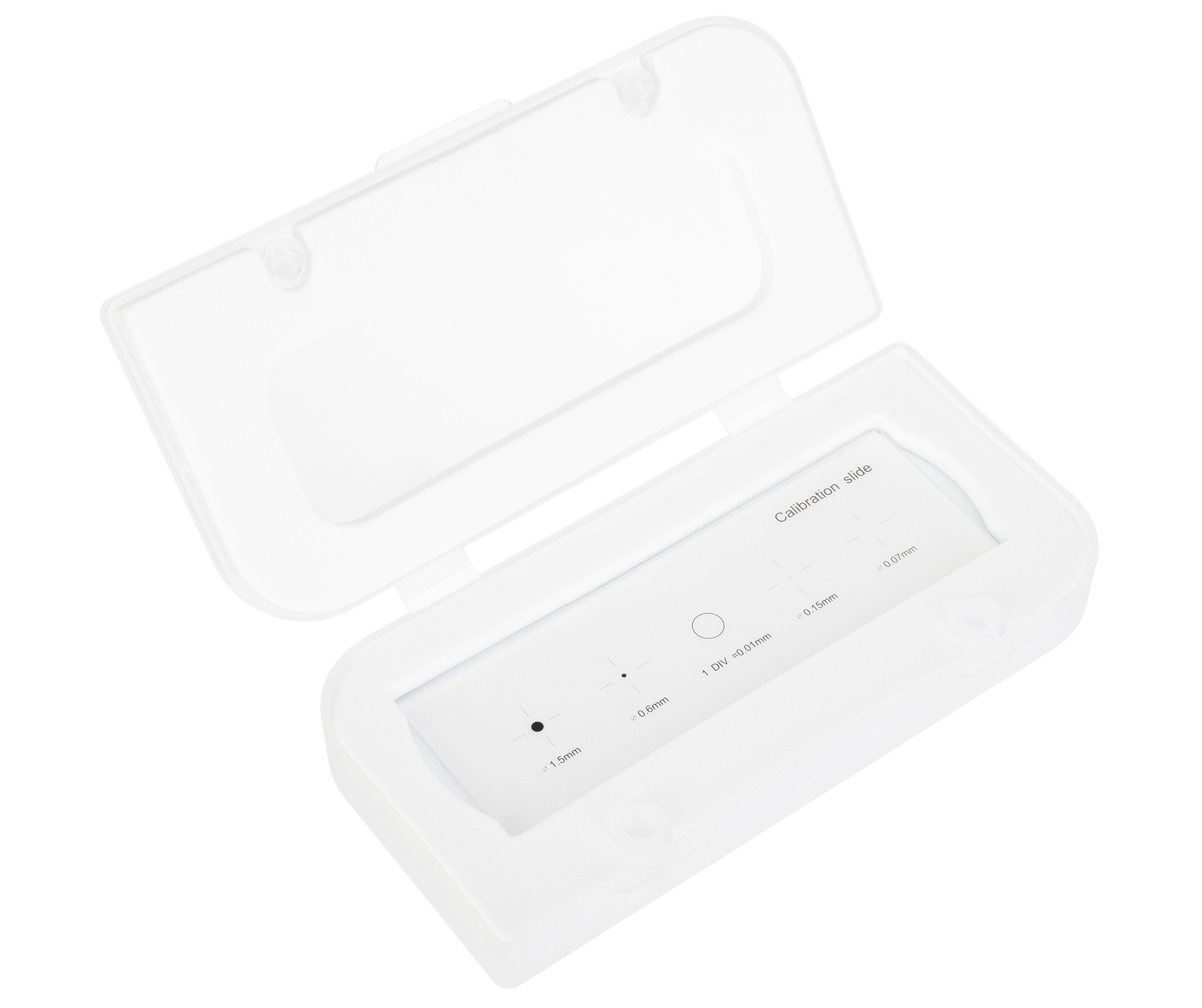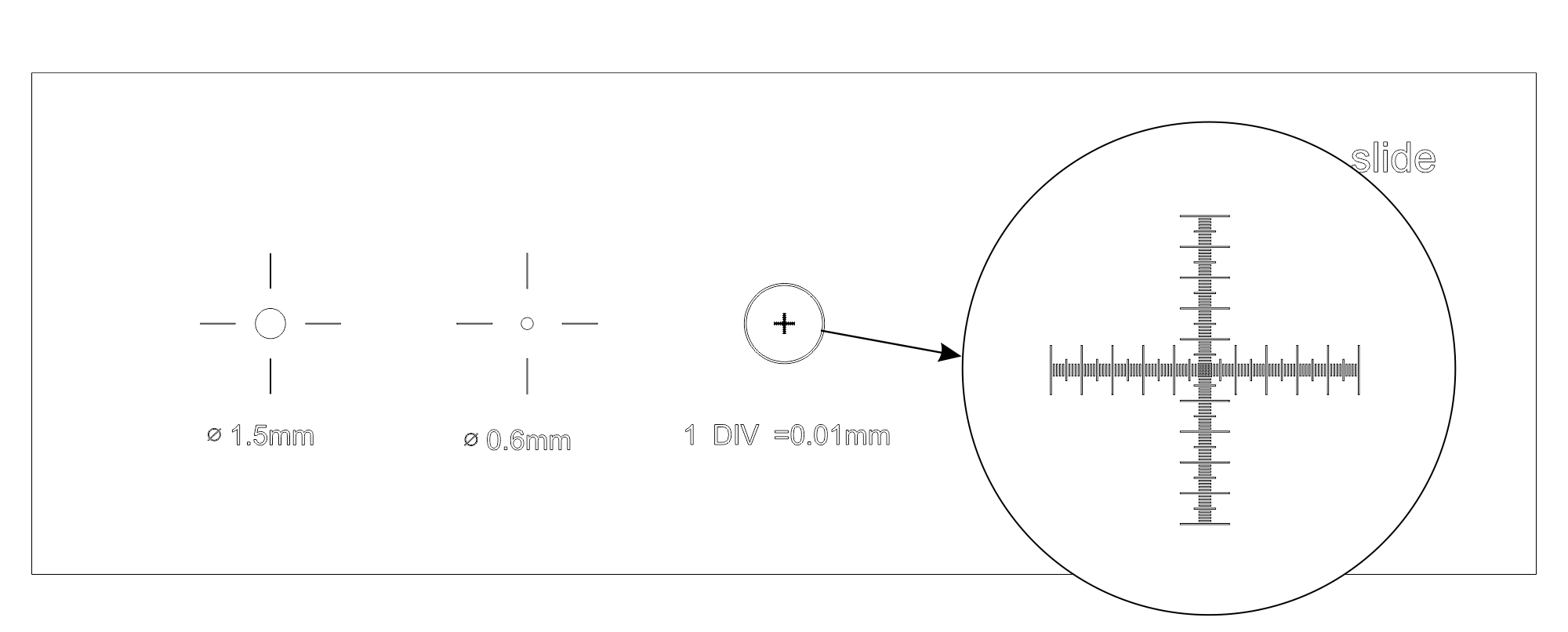 Калибровочный слайд MAGUS CS5 (XY0,01/0,07/0,15/0,6/1,5) по своим размерам соответствует стандартному предметному стеклу. Материалом изготовления послужило оптическое стекло. На слайд нанесены окружности, диаметр которых составляет 0,07 мм, 0,15 мм, 0,6 мм и 1,5 мм, есть также горизонтальная и вертикальная микрометрические шкалы на 100 делений. Цена одного деления – 0,01 мм.