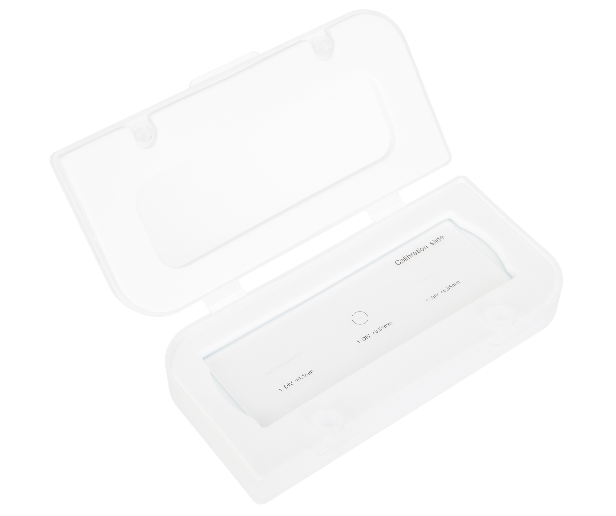 Калибровочный (микрометрический) слайд нужен для внесения корректировок в программу анализа изображений – с его помощью определяется поправочный коэффициент, который позволяет повысить точность измерений. Также калибровочный слайд может быть использован для калибровки окулярной шкалы.