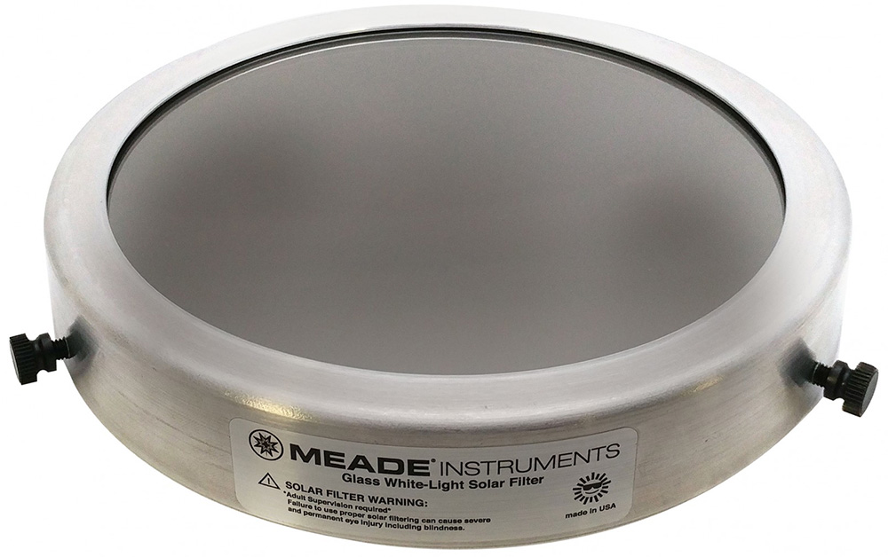 С солнечным фильтром Meade вы сможете наблюдать солнечные затмения, факельные поля, грануляцию, транзиты планет по солнечному диску и солнечные пятна. Этот аксессуар разработан для телескопов с апертурой от 232 до 238 мм и предназначен для блокирования вредного для глаз солнечного излучения. Коэффициент светопропускания составляет всего 0,001%. Цвет Солнца при наблюдениях – белый.