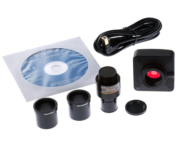 Видеоокуляр комплектуется двумя адаптерами, позволяющими устанавливать камеру на микроскопы с разными размерами окулярной трубки. Сам видеоокуляр имеет стандартное крепление C-Mount, поэтому пользователь дополнительно может использовать любые другие адаптеры.