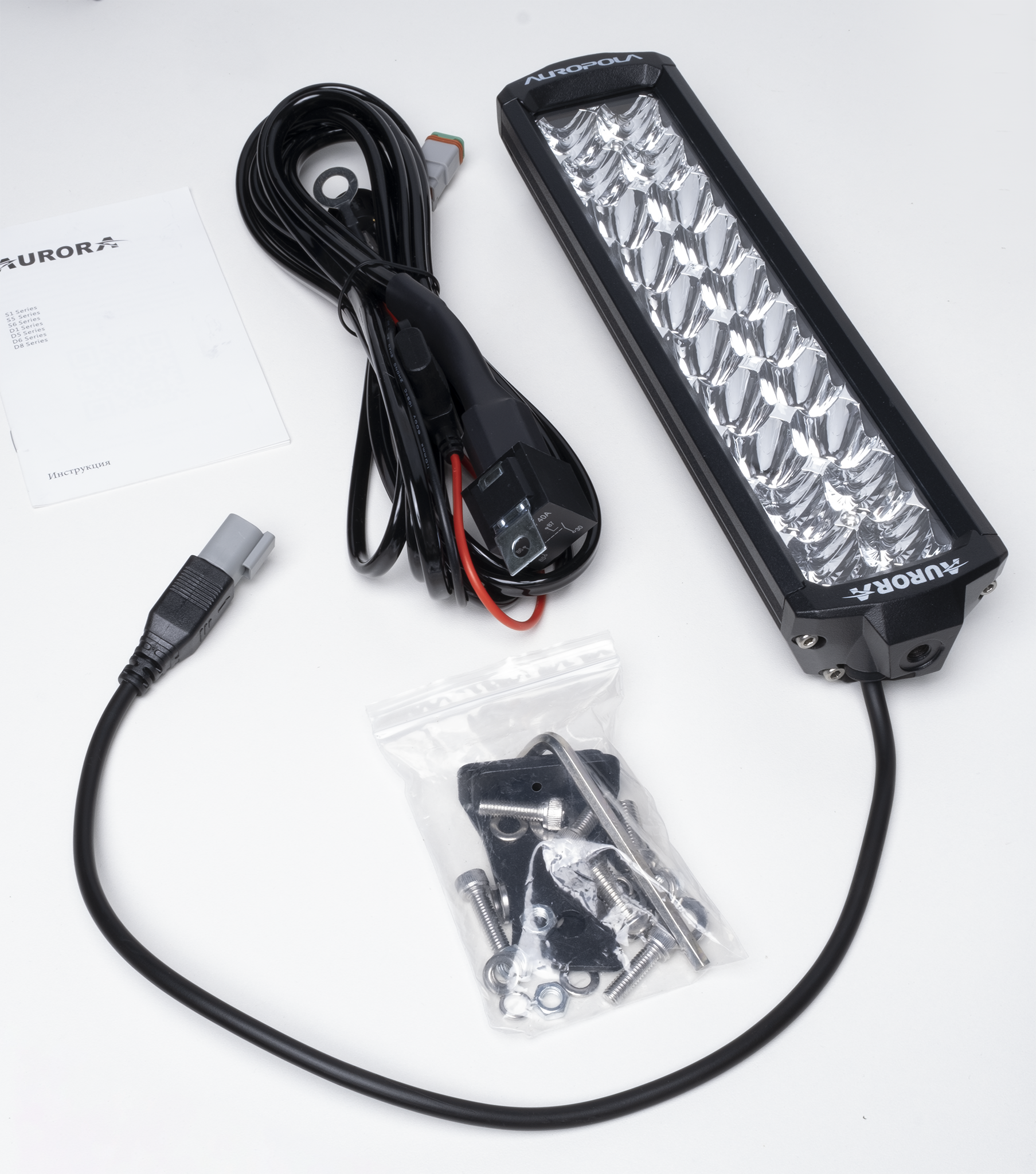Комплект:фара-балка-1шт.крепление-2штпровода подключения (реле,предохранитель, разъем,кнопка)-1шт