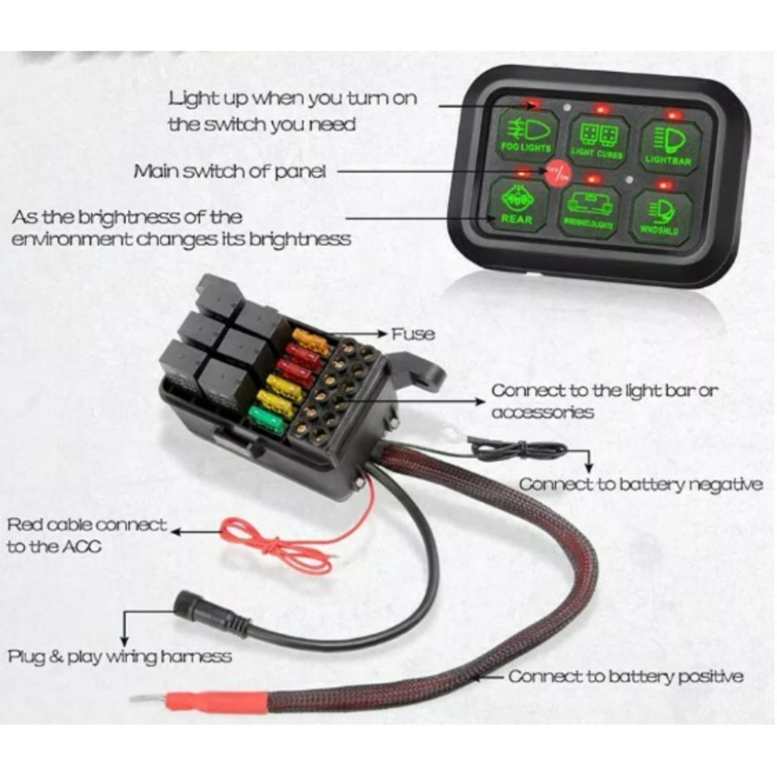 Но что делает эту панель по-настоящему уникальной? Она обладает не только высокой мощностью, но и множеством функций, которые позволяют вам полностью контролировать освещение в вашем автомобиле. На панели имеются переключатели, с помощью которых вы можете включать и выключать различные группы света, такие как фары, противотуманные фонари, подсветка салона или любые другие световые аксессуары, которые вы установили в своем автомобиле.