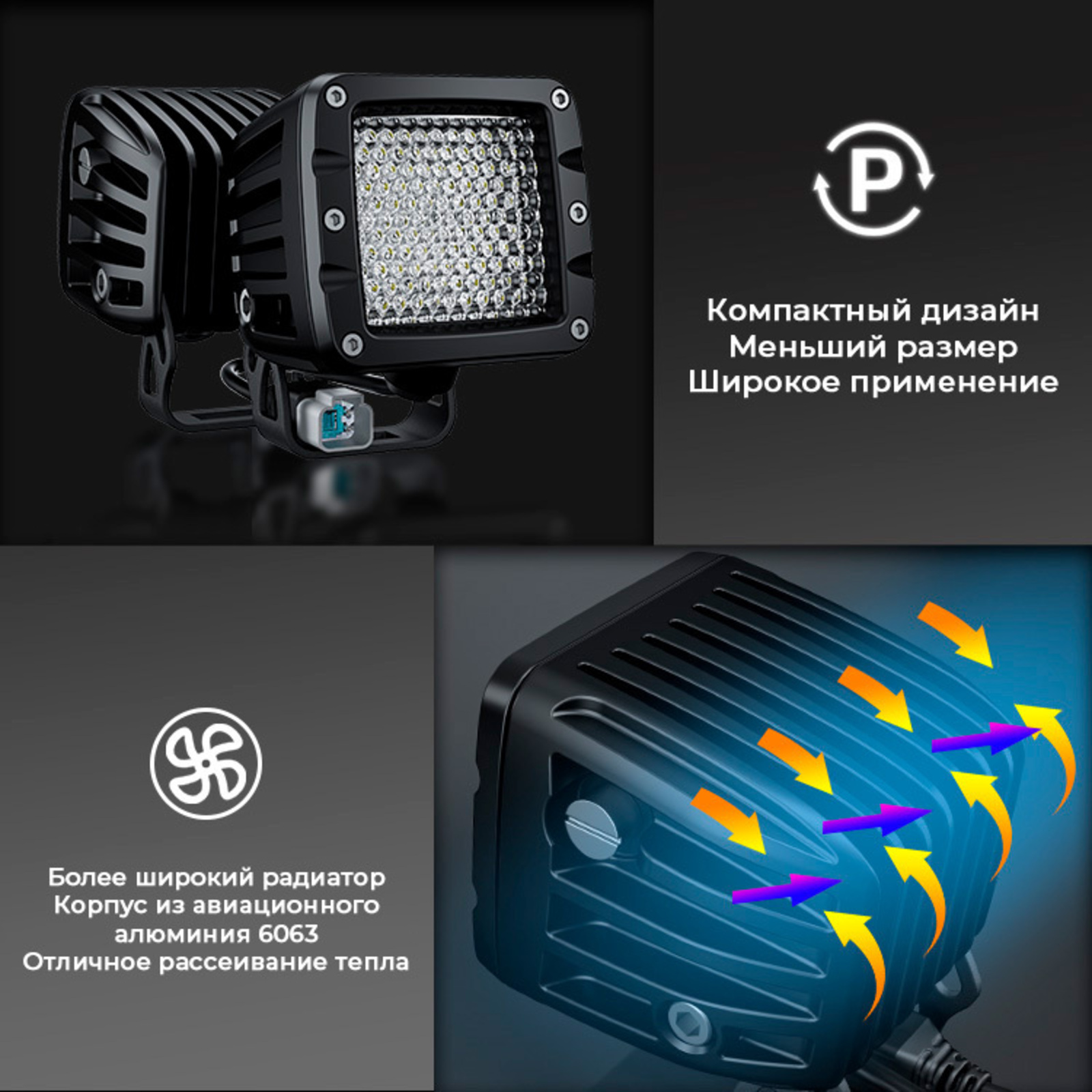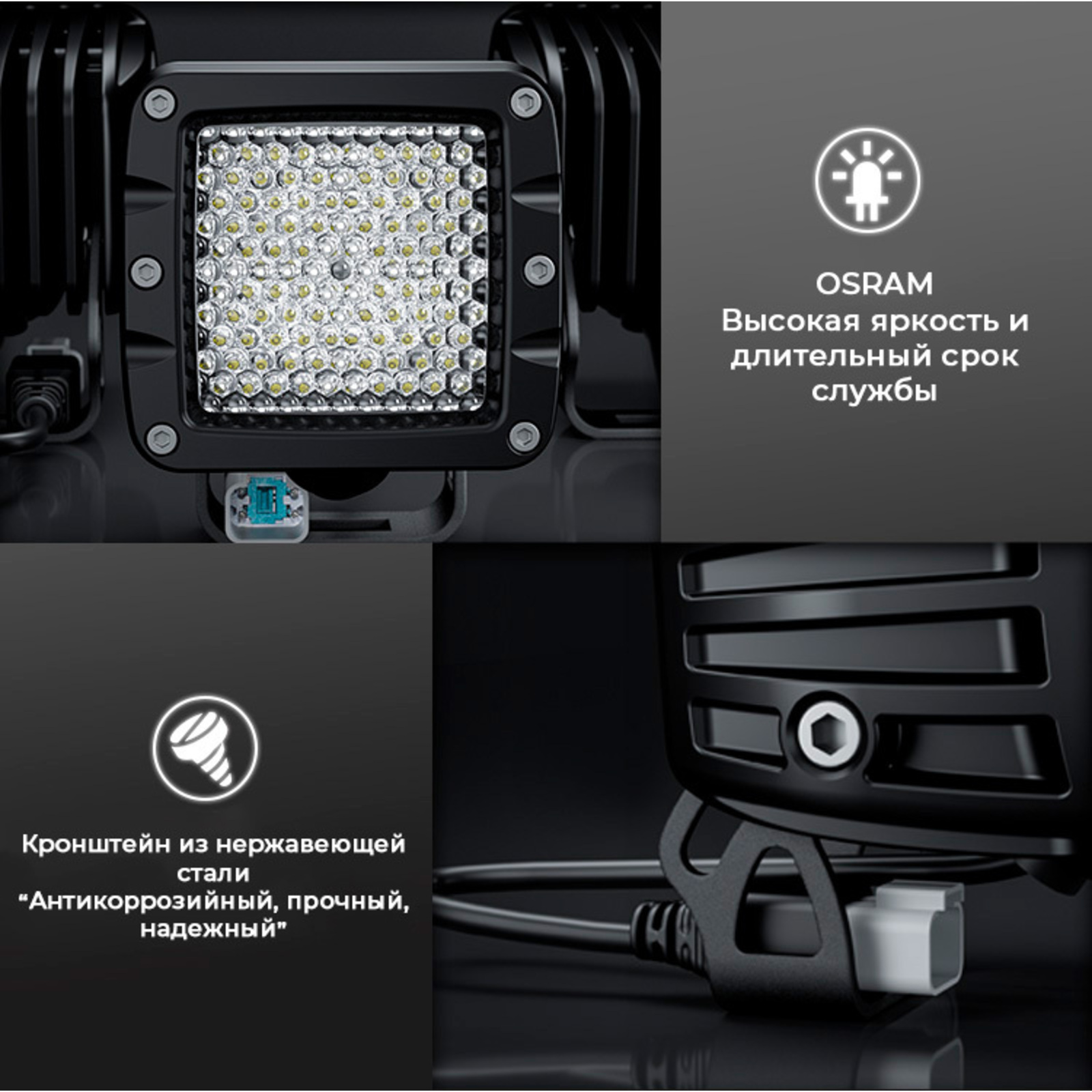 - Надежность и долговечность: Спроектирована для работы в экстремальных условиях, что подтверждается высокой степенью защиты IP69K. Это позволяет использовать фару даже в самых сложных климатических условиях.