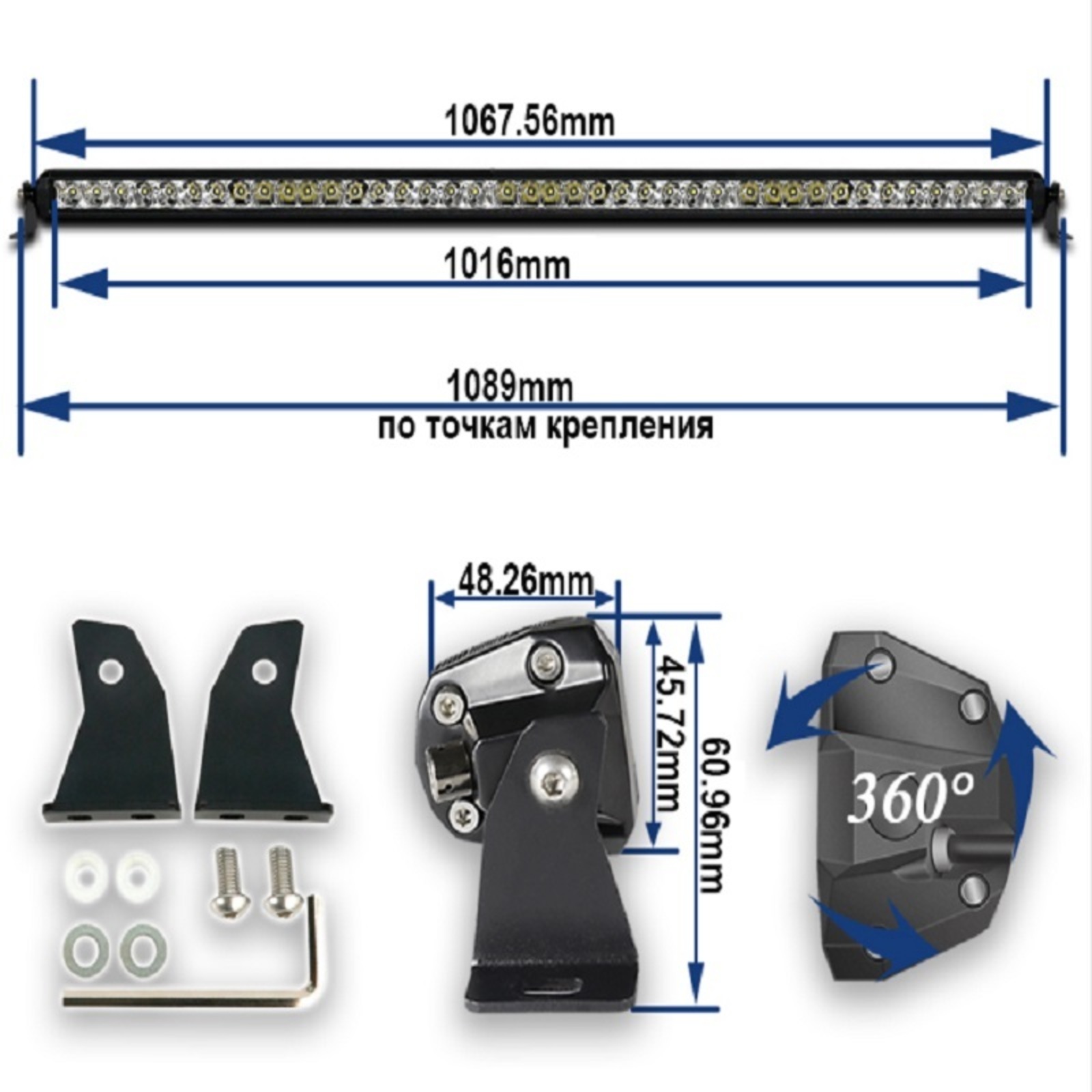Комплект:фара-балка-1шт.крепление-2штпровода подключения (реле,предохранитель, разъем,кнопка)-1шт