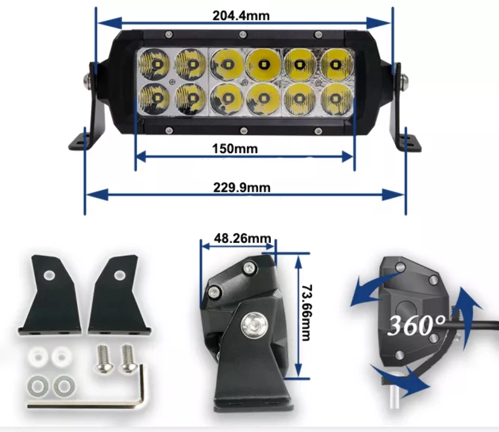 - Комплектация: В комплекте идет 1 фара-балка, 2 крепления для установки и провода подключения, что облегчает монтаж и позволяет быстро начать использование.