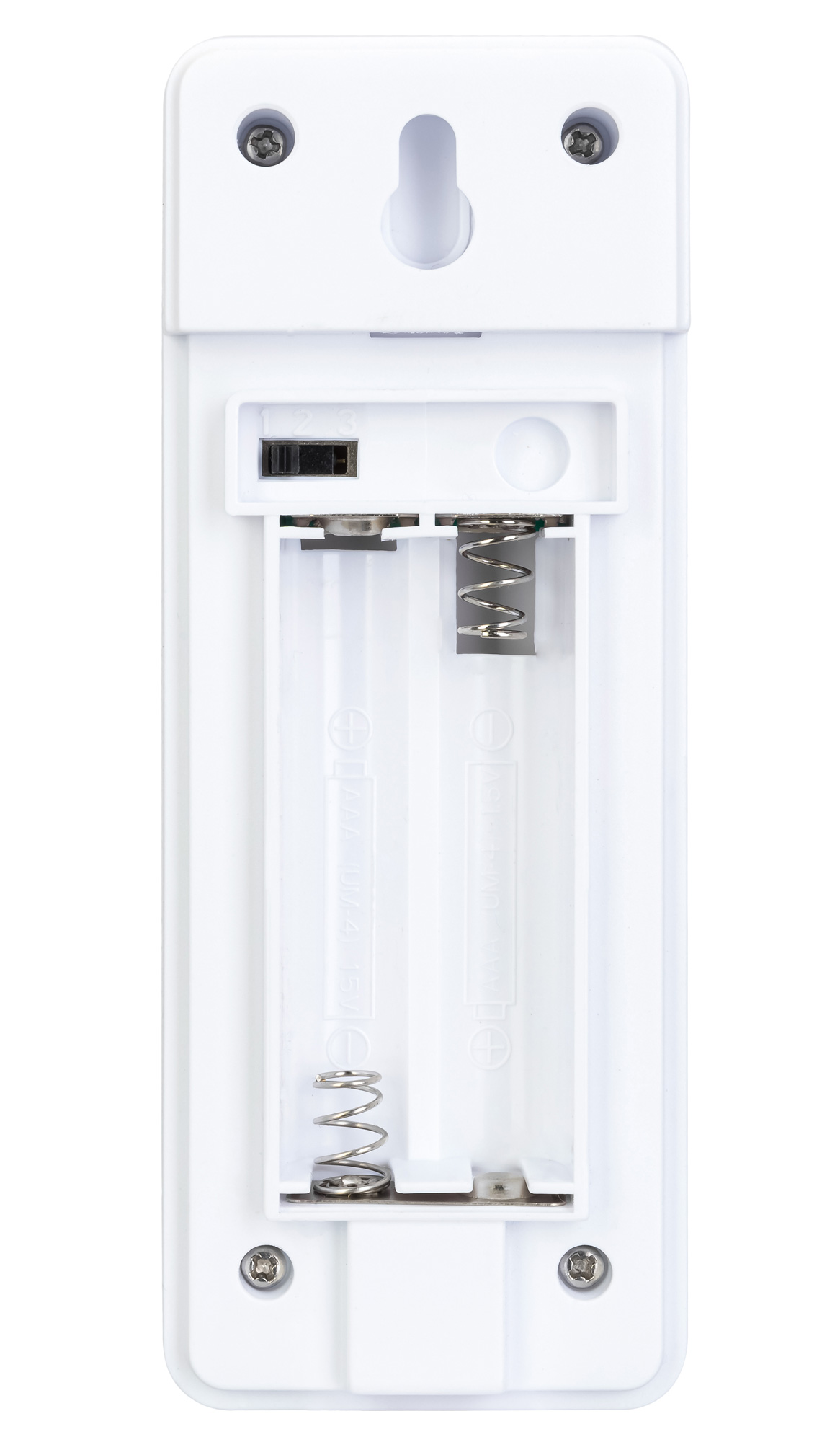 Датчик можно разместить на улице или в помещении. На задней крышке есть стандартное крепление для монтажа на стену. Для питания не требуется подключение к сети, прибор работает от стандартных батареек.