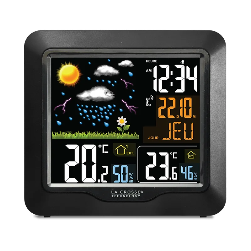 Индекс жары, точка росы, календарь, часы, будильник, индикаторы заряда батареи и уровня сигнала внешнего датчика, основные параметры температуры и влажности и прогноз погоды - все это отражается на ЖК-дисплее в разных цветовых решениях, что позволяет систематизировать данные и легко найти на метеостанции нужные вам сведения.