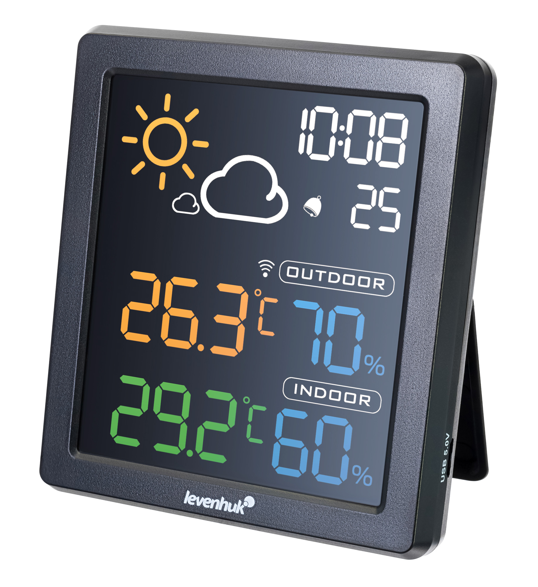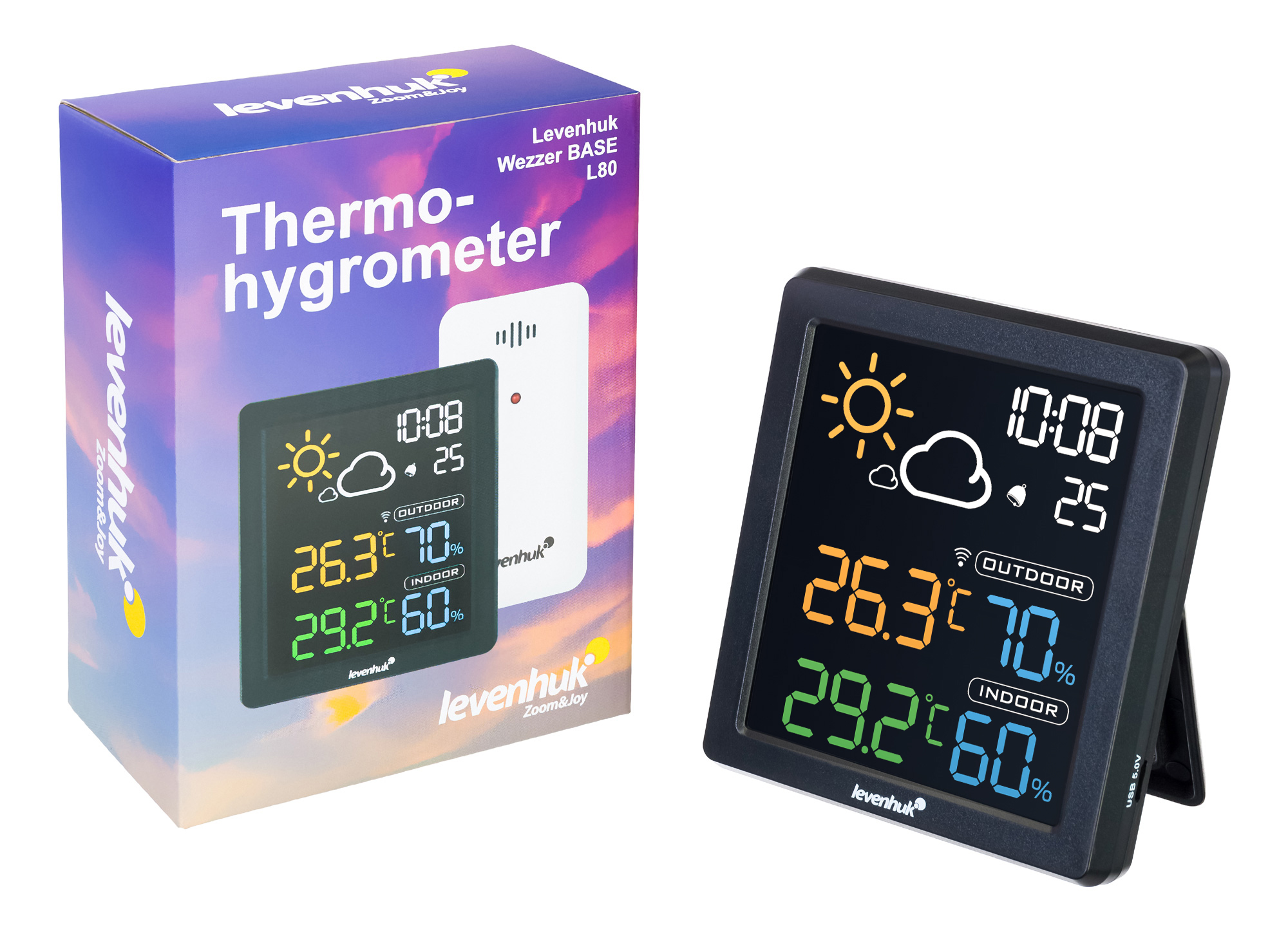 Levenhuk Wezzer BASE L80 – настенный термогигрометр с цветным ЖК-экраном. Благодаря привлекательному внешнему виду и многофункциональности он отлично подойдет на роль полезного подарка. Прибор регистрирует температуру и влажность как внутри, так и снаружи дома, фиксируя в памяти наибольшие и наименьшие показания. Есть здесь и наглядный прогноз погоды. Еще одно преимущество – наличие часов со встроенным будильником. Его сигнал откладывается на 5 минут одним нажатием кнопки.