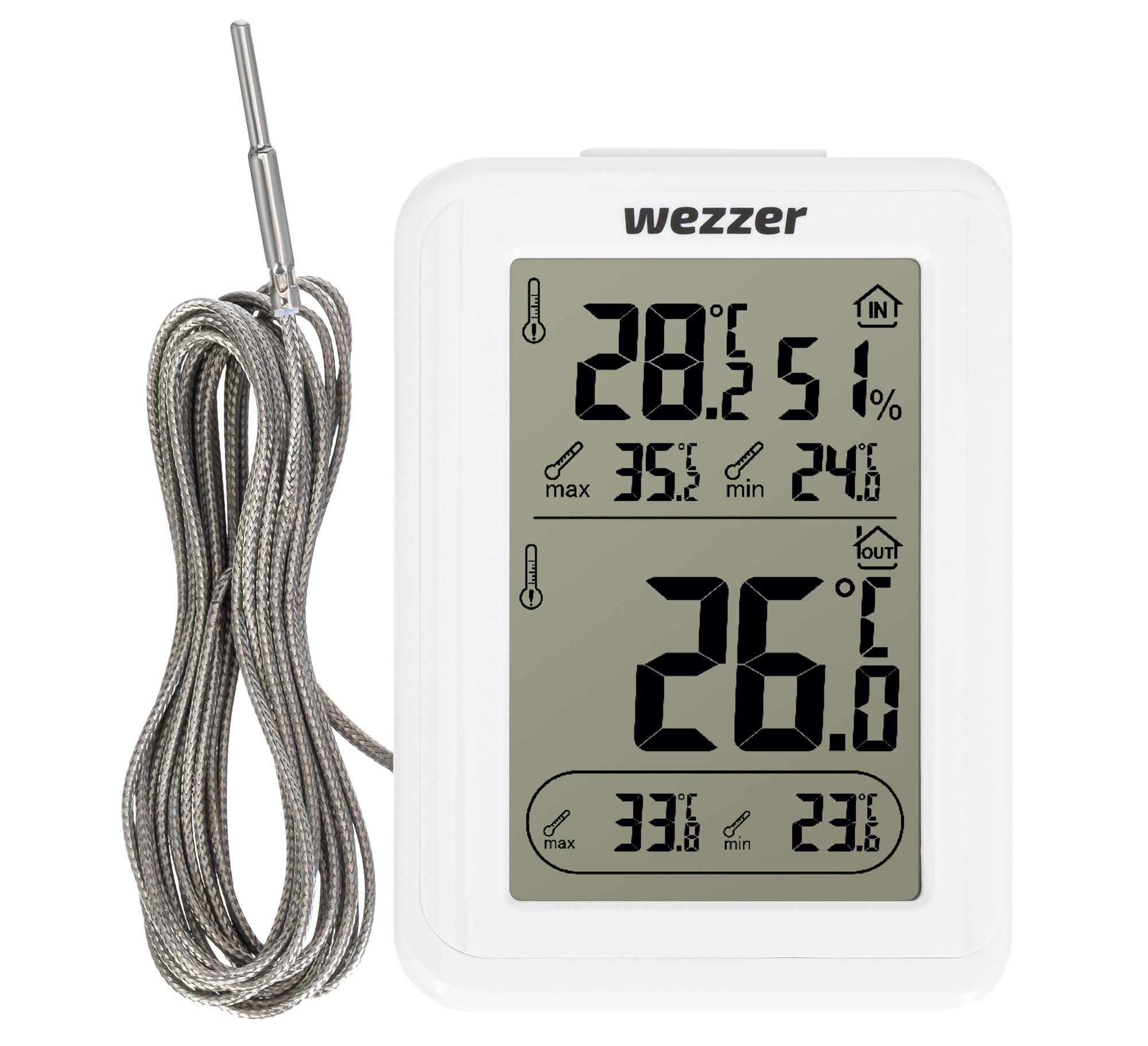Верхняя часть экрана – это измерения основного модуля, нижняя – измерения термощупа. Для обоих помимо текущей температуры определяются также минимумы и максимумы. Основной блок дополнительно измеряет уровень влажности воздуха.