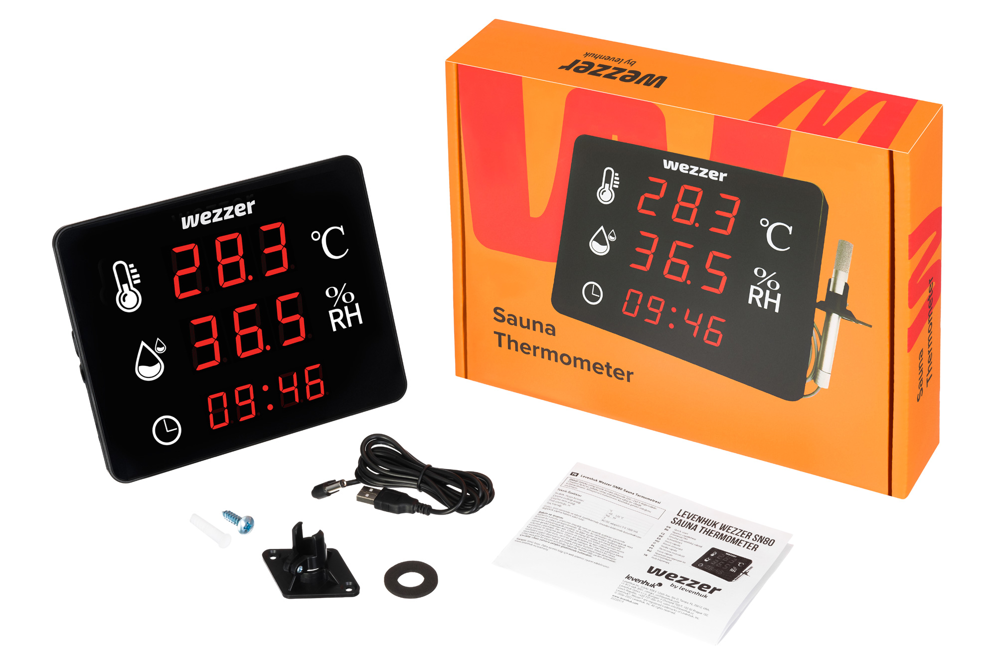 Levenhuk Wezzer SN80 – термометр и гигрометр в одном приборе. Он создан специально для проведения измерений в сауне, где температура и влажность воздуха могут повышаться очень сильно. Чтобы избежать негативных последствий для здоровья и создать максимально комфортные условия для процедур, установите термогигрощуп прямо в парильном помещении и отслеживайте малейшие колебания показателей на экране основного модуля. Сам модуль из-за наличия электронных компонентов должен находится вне парной.