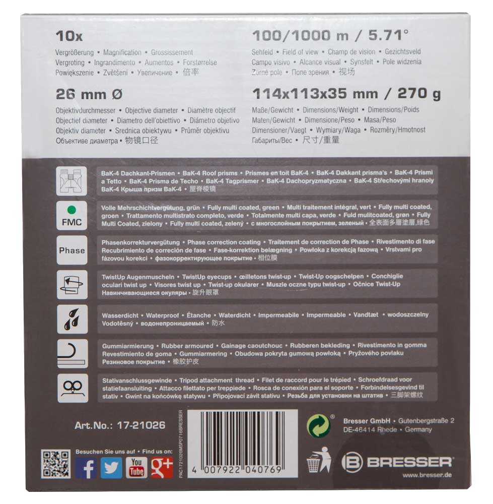 Бинокль Bresser Pirsch 10x26 – это премиум-бинокль для наблюдений в дневное время. Благодаря небольшим размерам и малому весу он идеально подходит для путешественников и туристов, а герметичная конструкция позволяет использовать его вблизи воды. Бинокль не боится дождя, снега, экстремальных температур, поэтому вы сможете взять его в горы, на морскую прогулку, в поход или на пикник. Bresser Pirsch 10x26 – удобный и надежный оптический прибор для обзорных наблюдений в городе или на природе.