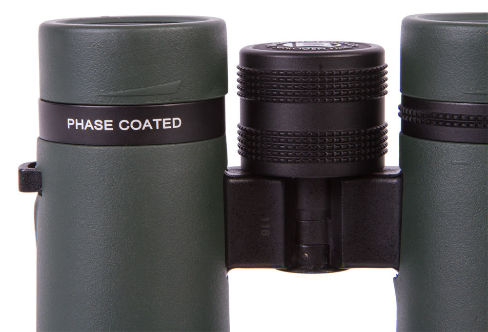 В бинокле установлены roof-призмы с фазокорректирующим покрытием, которое увеличивает контрастность картинки и делает ее более читаемой и ясной. На линзы нанесены два покрытия: многослойное просветляющее и светоотражающее. Оба улучшают четкость и детализацию изображения, убирают паразитные отблески и артефакты.