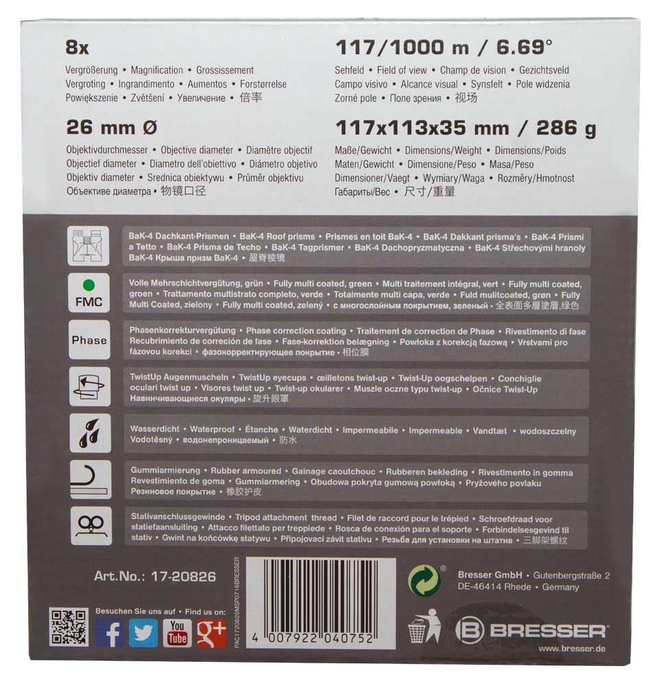 Оптика помещена в ударопрочный пластиковый корпус. Отдельные элементы конструкции сделаны из металла. Внутри бинокль полностью заполнен инертным газом, а снаружи защищен слоем резины. Линзы и призмы Bresser Pirsch 8x26 не запотевают, корпус не пропускает воду, а сам бинокль надежно и удобно лежит в руках.