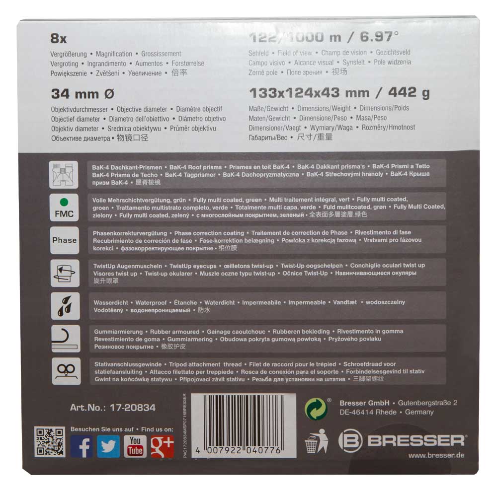 Бинокль Bresser Pirsch 8x34 – оптический прибор премиум-уровня, который оценят требовательные пользователи. Он гармонично сочетает в себе отличные оптические возможности и прочную и неприхотливую конструкцию. Бинокль можно использовать в сильный дождь или вблизи воды – влага не нанесет ему никакого вреда. Bresser Pirsch 8x34 – прекрасный выбор для туриста, путешественника, любителя концертов и спортивных мероприятий на стадионе.