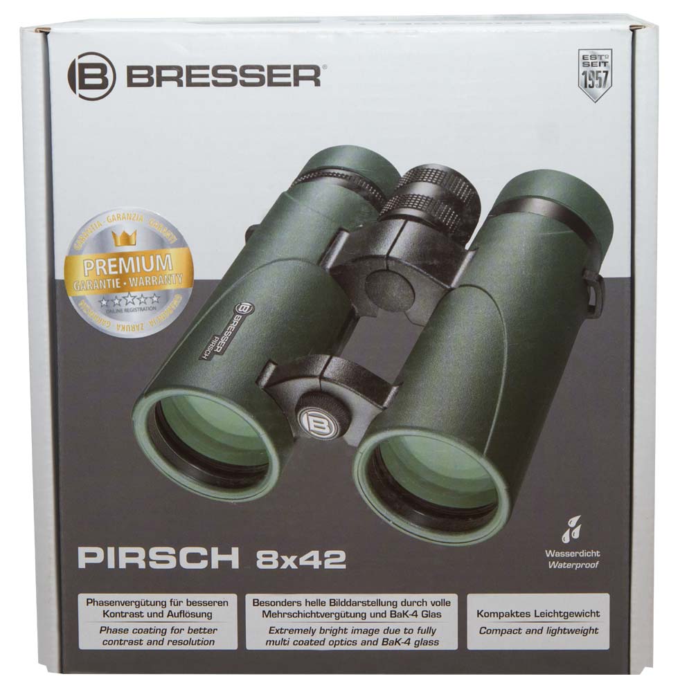 Bresser Pirsch 8x42 – полевой бинокль с высококачественной оптикой, защищенный ударопрочным герметичным корпусом. Этот оптический прибор оценят любители походов, охотники, рыбаки – все, кто привык использовать оптический прибор без оглядки на погоду и дорожные трудности. Бинокль Bresser Pirsch 8x42 – это гармоничное сочетание надежной конструкции и прекрасных оптических возможностей.