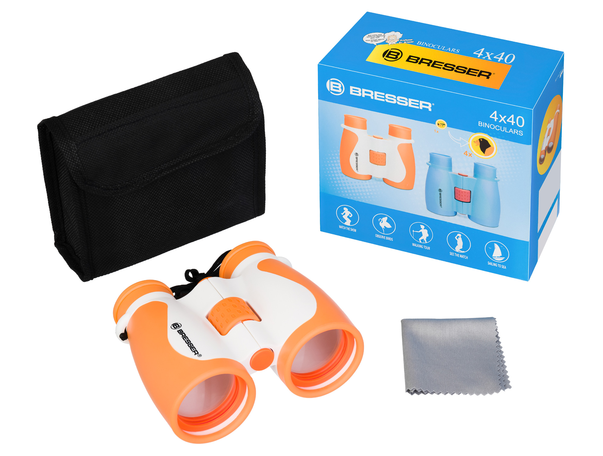 Бинокль Bresser Junior 4x40 является детским только по размерам и весу, внутри же него – полноценная оптическая система на основе roof-призм и линз из стекла K9. Стеклянная оптика не только создает четкое и контрастное изображение, но также является наиболее предпочтительной для детей, так как в отличие от пластиковой не искажает передаваемую картинку и не вызывает перенапряжения глаз. Увеличение составляет 4 крата.