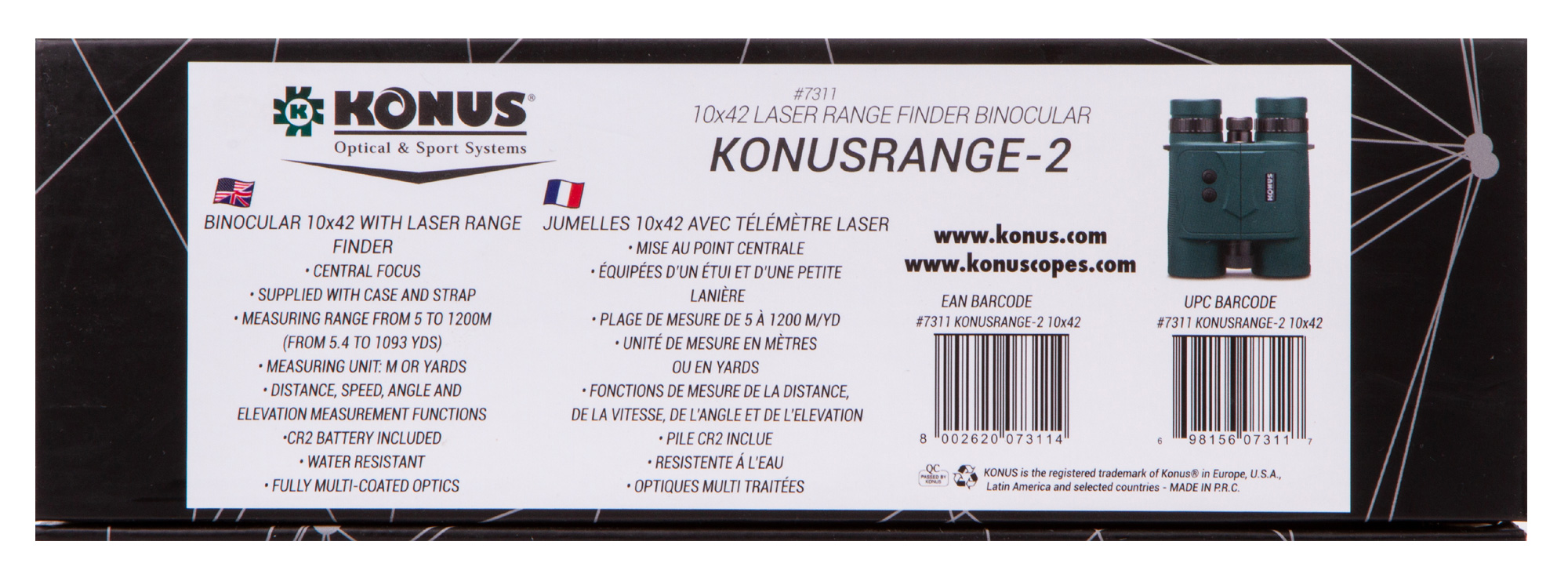 Бинокль Konus Konusrange-2 10x42 снабжен встроенным дальномером, поэтому его можно использовать не только для визуальных наблюдений, но и для измерений на местности. Функционал дальномера разнообразен: он определяет не только расстояние до объекта, но и его высоту, и скорость перемещения, также можно измерять углы. Благодаря этому бинокль станет отличным помощником на охоте, когда необходимо точно рассчитать местоположение дичи.