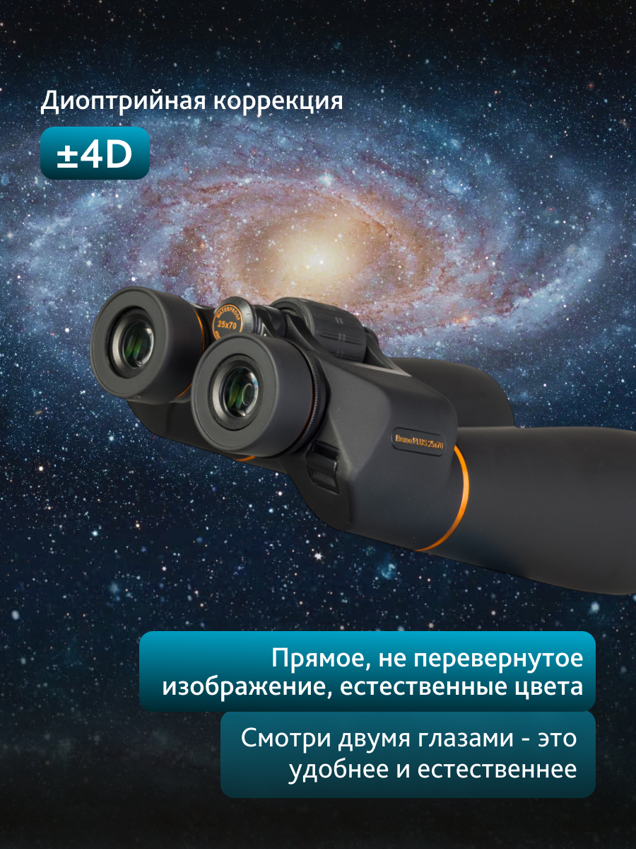 Бинокль Levenhuk Bruno PLUS 25x70 создан для тех, кто одинаково увлечен далекими уголками космоса и завораживающими земными ландшафтами. Прибор позволяет ночью рассмотреть рельеф лунных кратеров, слабосветящиеся туманности, звездные скопления, а днем – мельчайшие элементы удаленного пейзажа или поведение диких животных с безопасной дистанции.