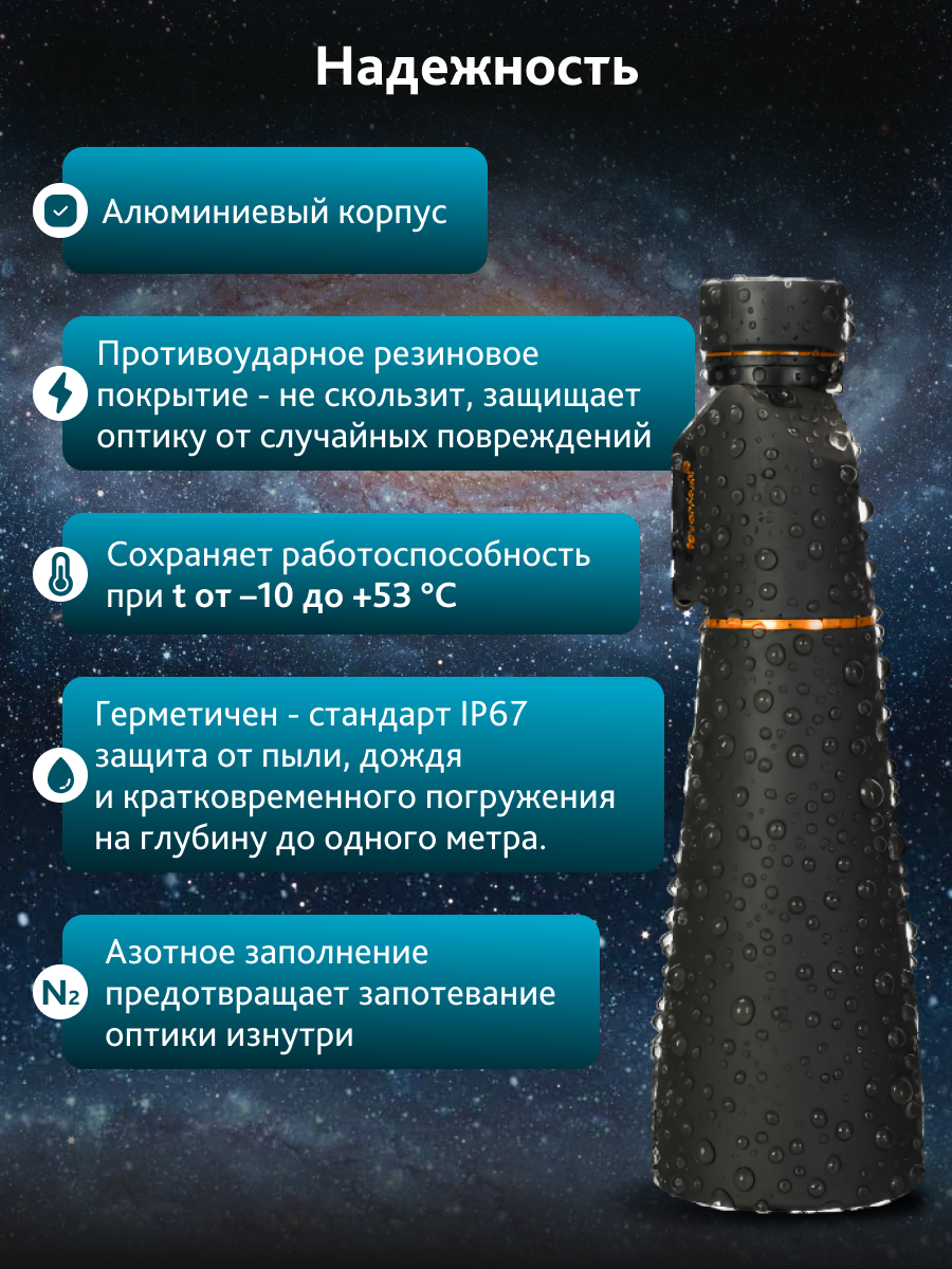Корпус из алюминиевого сплава дополнен резиновым покрытием и полностью герметичен по стандарту IP67: прибор защищен от пыли, ливневого дождя и кратковременного погружения на глубину до одного метра. Азотное заполнение предотвращает запотевание оптики изнутри при резких перепадах температуры. Диоптрийная коррекция ±4 D и поворотно-выдвижные наглазники с тремя фиксируемыми позициями обеспечивают наблюдателю точную настройку под индивидуальное зрение. Надежный хват прибора сохраняется даже в перчатках, а механическая стойкость конструкции выдерживает случайные удары в полевых условиях. Все это делает бинокль долговечным спутником для самых требовательных астрономов-любителей и натуралистов, которые ценят сочетание оптической мощи и готовности к непредсказуемой погоде.