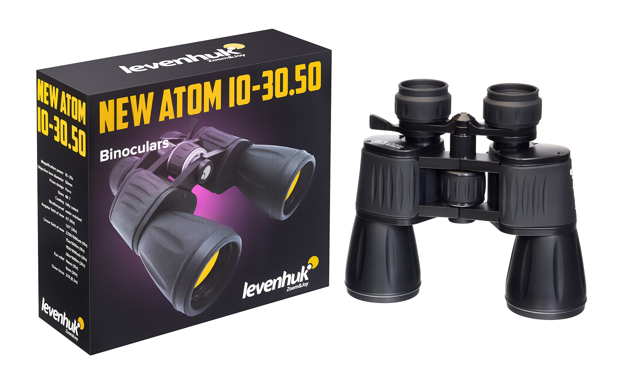 Поверхность изготовленного из алюминиевого сплава корпуса прибора покрыта резиной для удобства и надежности захвата. Полной водонепроницаемостью конструкция не обладает, но в умеренный дождь и тем более снегопад биноклем можно пользоваться без опасений благодаря защите IPX3. Levenhuk New Atom 10–30x50 весит менее килограмма, он укомплектован ремешком для удобства длительного ношения. Также в комплектацию бинокля входят защитные крышки для оптики, тканевый чехол и салфетка для ухода за объективами и окулярами.
